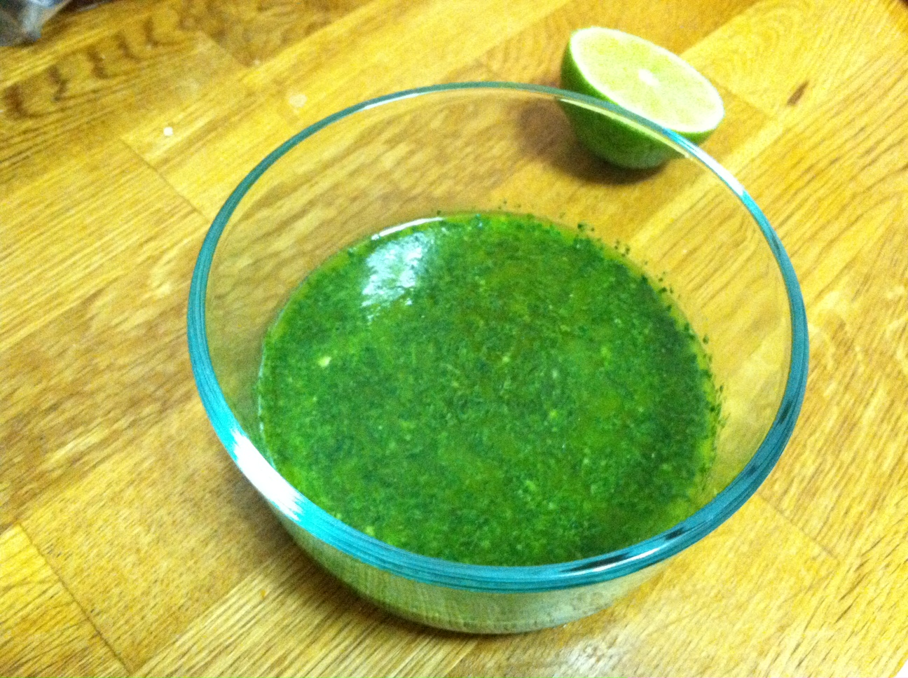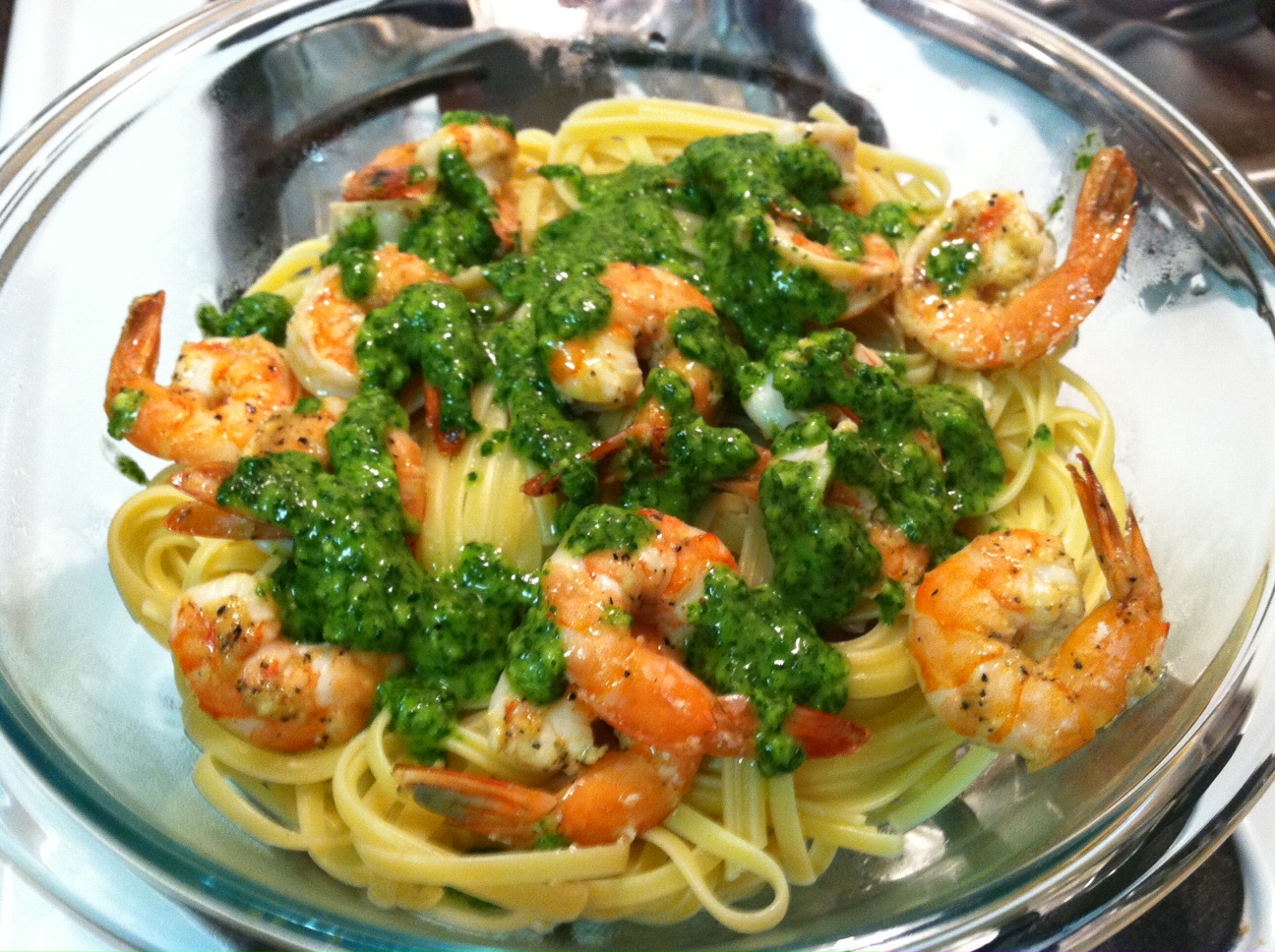 Rinse the cilantro to get rid of any dirt/grime. Rough chop, then toss in the food processor. Give the garlic and green chili a rough chop, too. Add them to the guest list. Add salt and lime juice and start the processor. While running, drizzle in the olive oil slowly to help emulsify. If it's not coming together to a nice saucy consistency, add more oil. Taste for seasoning and serve.Here I used it in lieu of basil pesto over roasted shrimp and linguine. Yum!