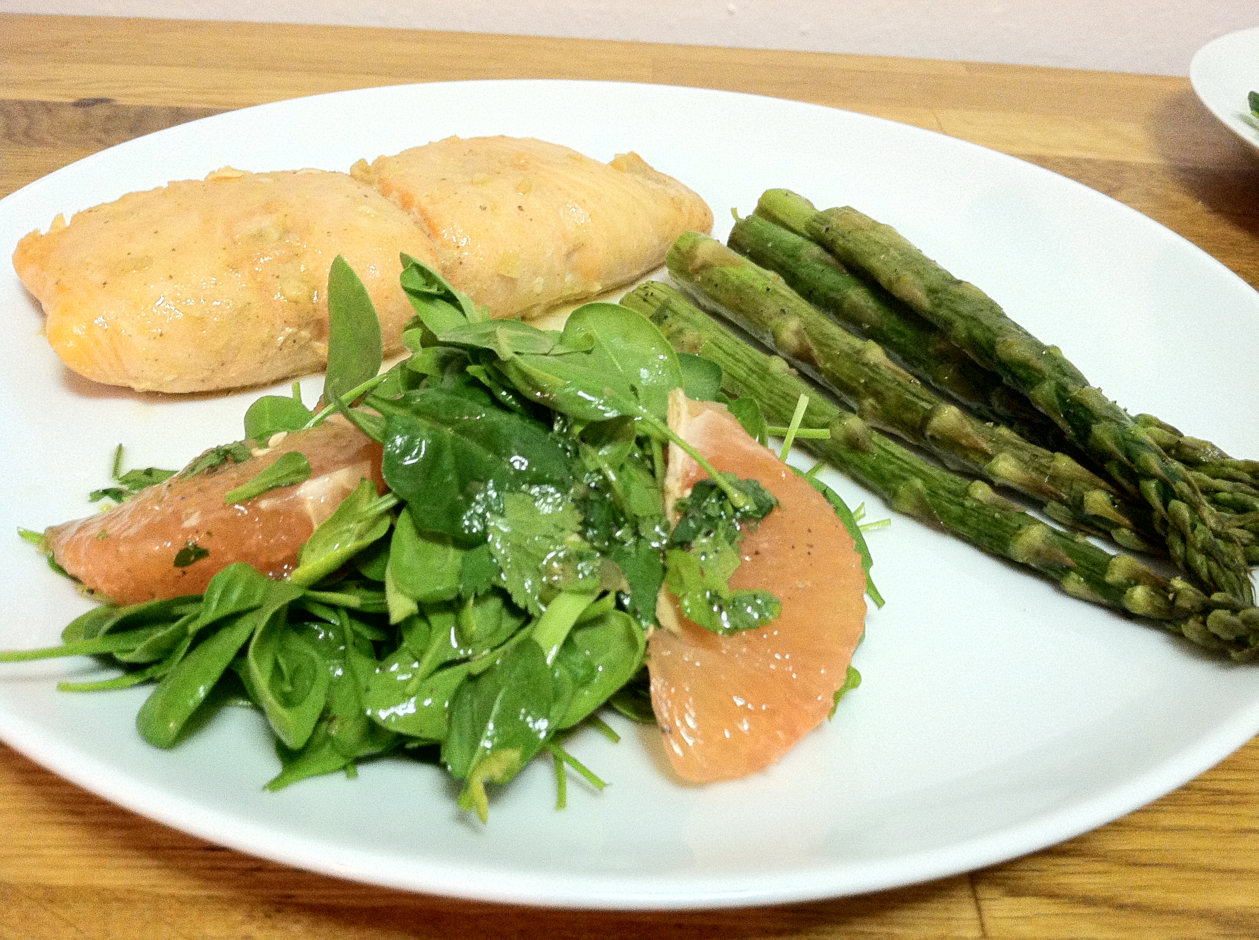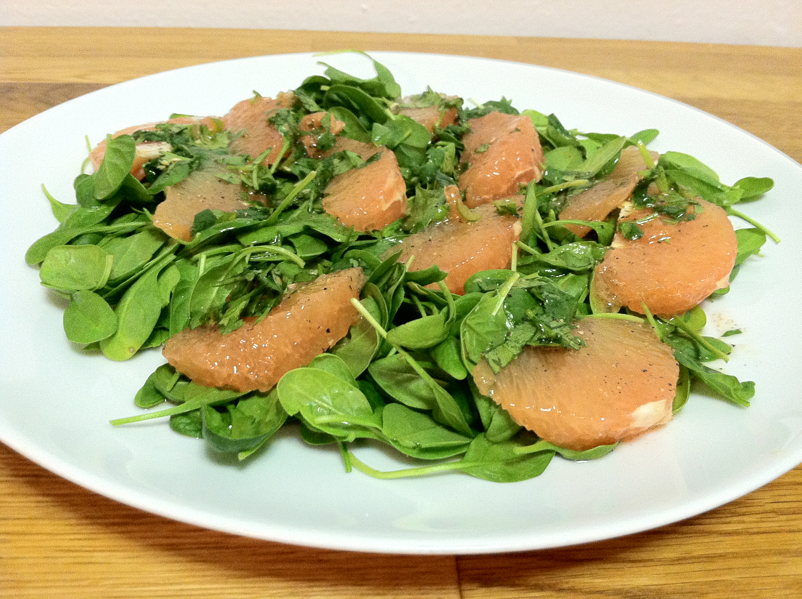 I did the unthinkable (for a South Asian): I made a carb free dinner that my husband and I enjoyed! Inspired by some uber fresh baby spinach I got from the farmer’s market (yess I finally made it to one this year) and some random grapefruit I picked up at Trader Joe’s. I usually segment my grapefruit, douse it in salt (and a dash of sugar) and eat it plain. I wanted a zesty and a tad more healthy way of eating it. Thus, this salad. It’s pretty simple…next time I might add some toasted walnuts or sliced avocado.