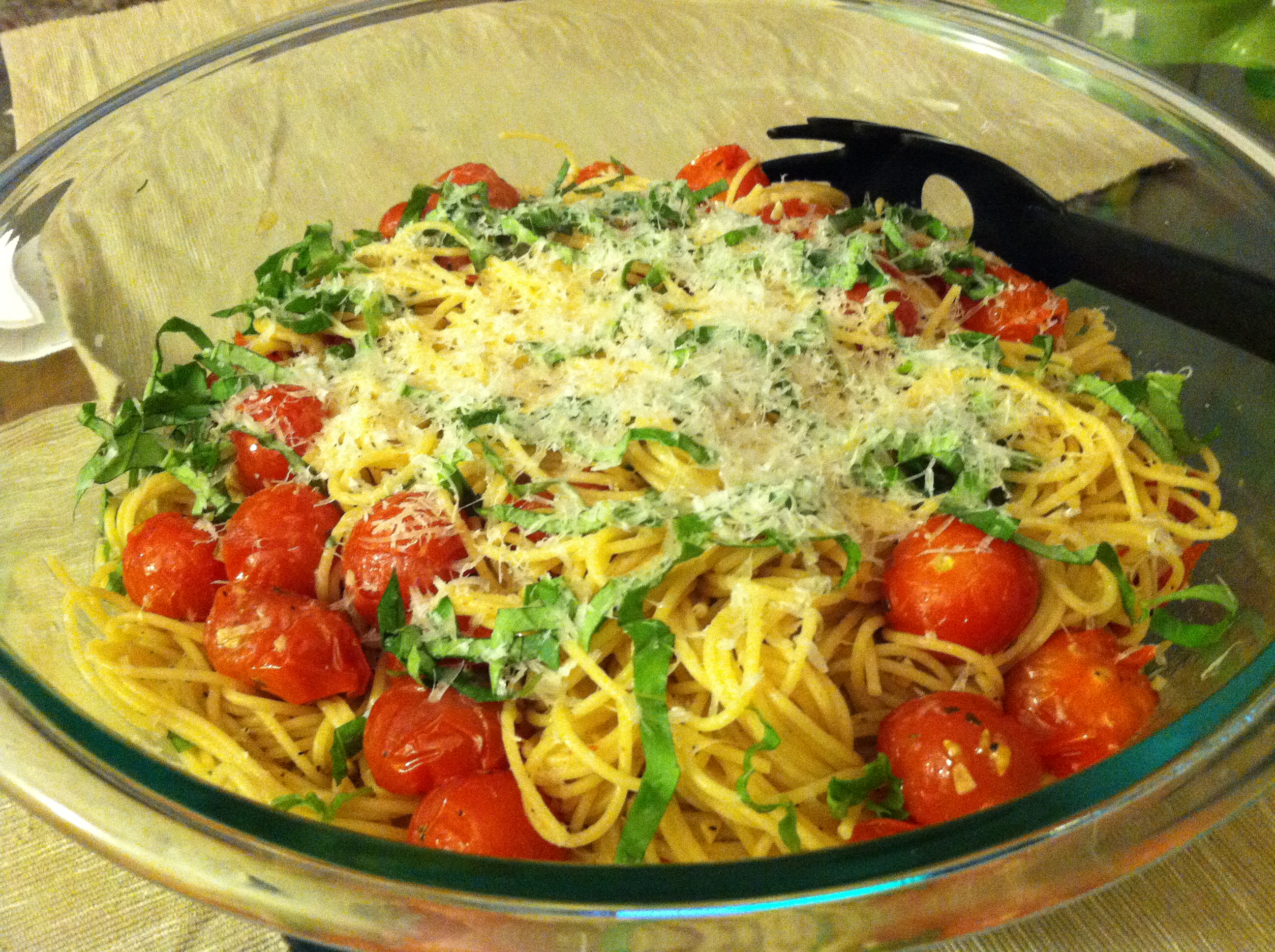 Nowadays, when I do find pockets of time when the stars align (I’ve got energy, the grandparents have taken the little one out), I look for recipes that are less involved, requiring fewer dishes to clean. I’ve seen many permutations of the thin-pasta-with-cherry-tomato-based sauce, including some from my favs (Giada’s linguine with shrimp, cherry tomatoes and asparagus or Ina’s summer garden pasta). I try not to be as pour-happy with the olive oil as Ina, and compensate the sparseness of the ingredients with the slow, careful nurturing of the complimenting flavors: garlic and red pepper flakes. Come to think of it, it is really a twist on the italian classic spaghetti con aglio, olio e peperoncino (spaghetti with garlic, olive oil and red pepper flakes).