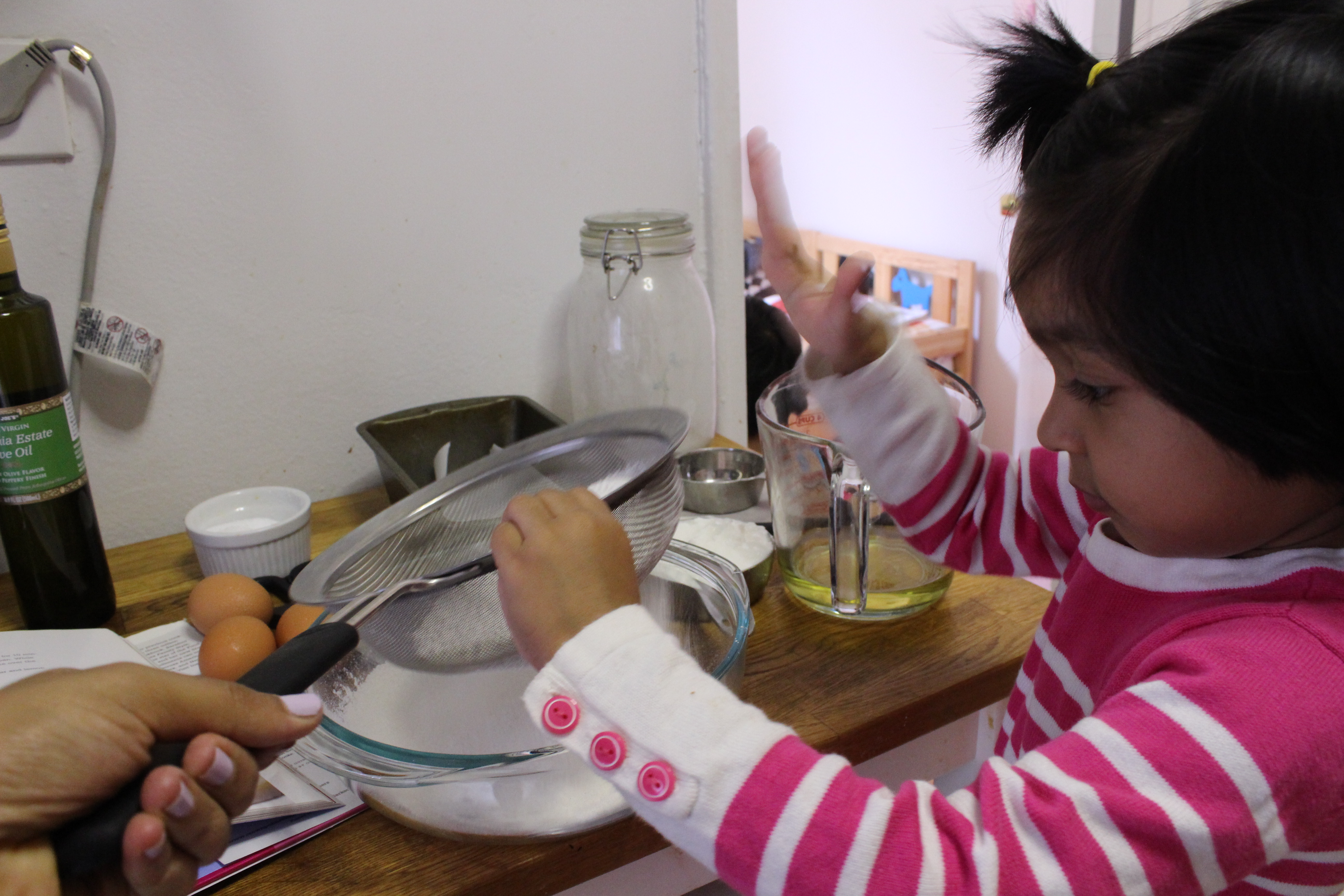 Inaya is my go to person for sifting dry ingredients together. She can almost mix wet batter, but needs a little help reining in her stirring excitement. Kudos to her since I am not easy to work with in the kitchen. Any one of my friends who have attempted to cook or bake with me only to run out screaming and flailing their arms can attest to that.�