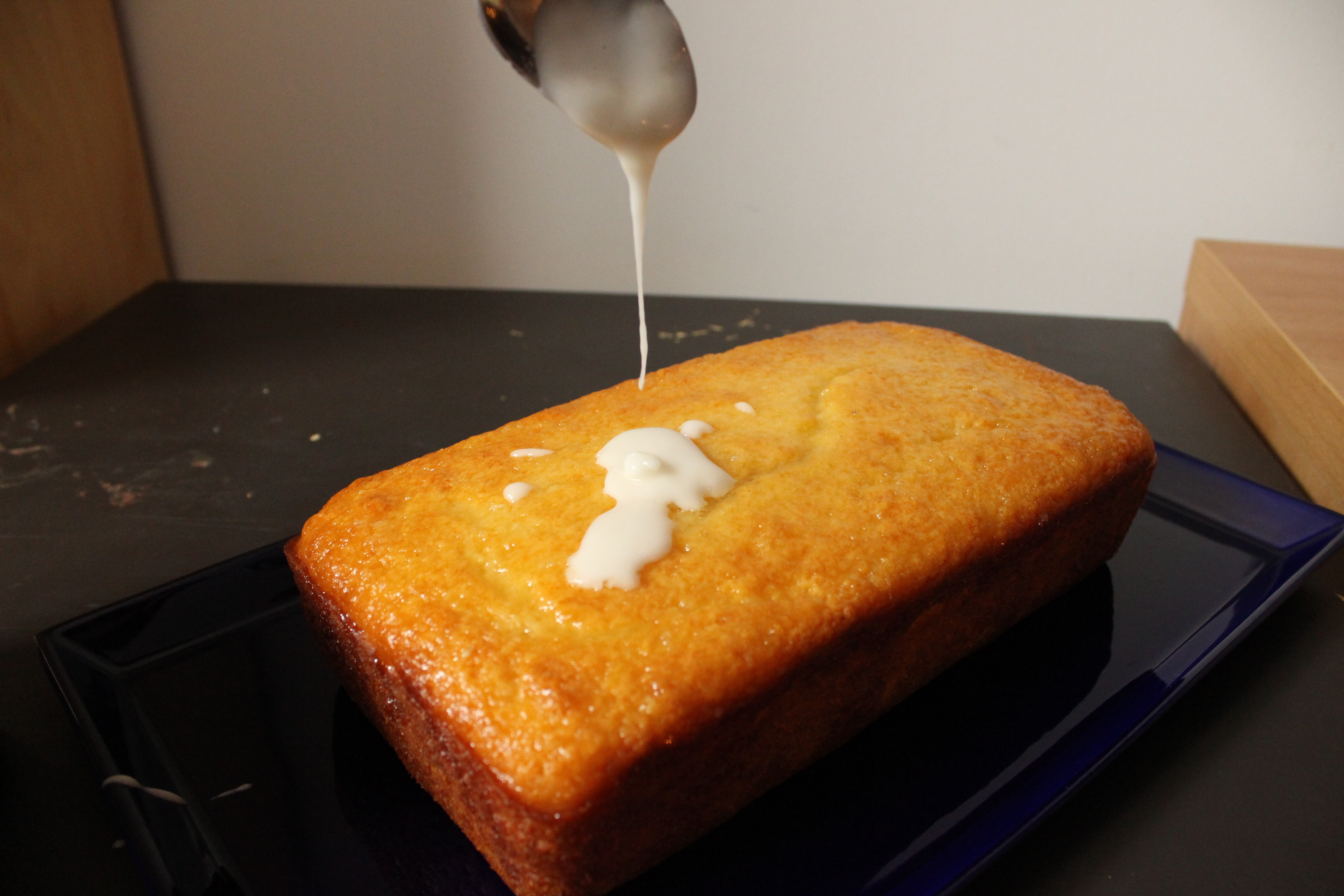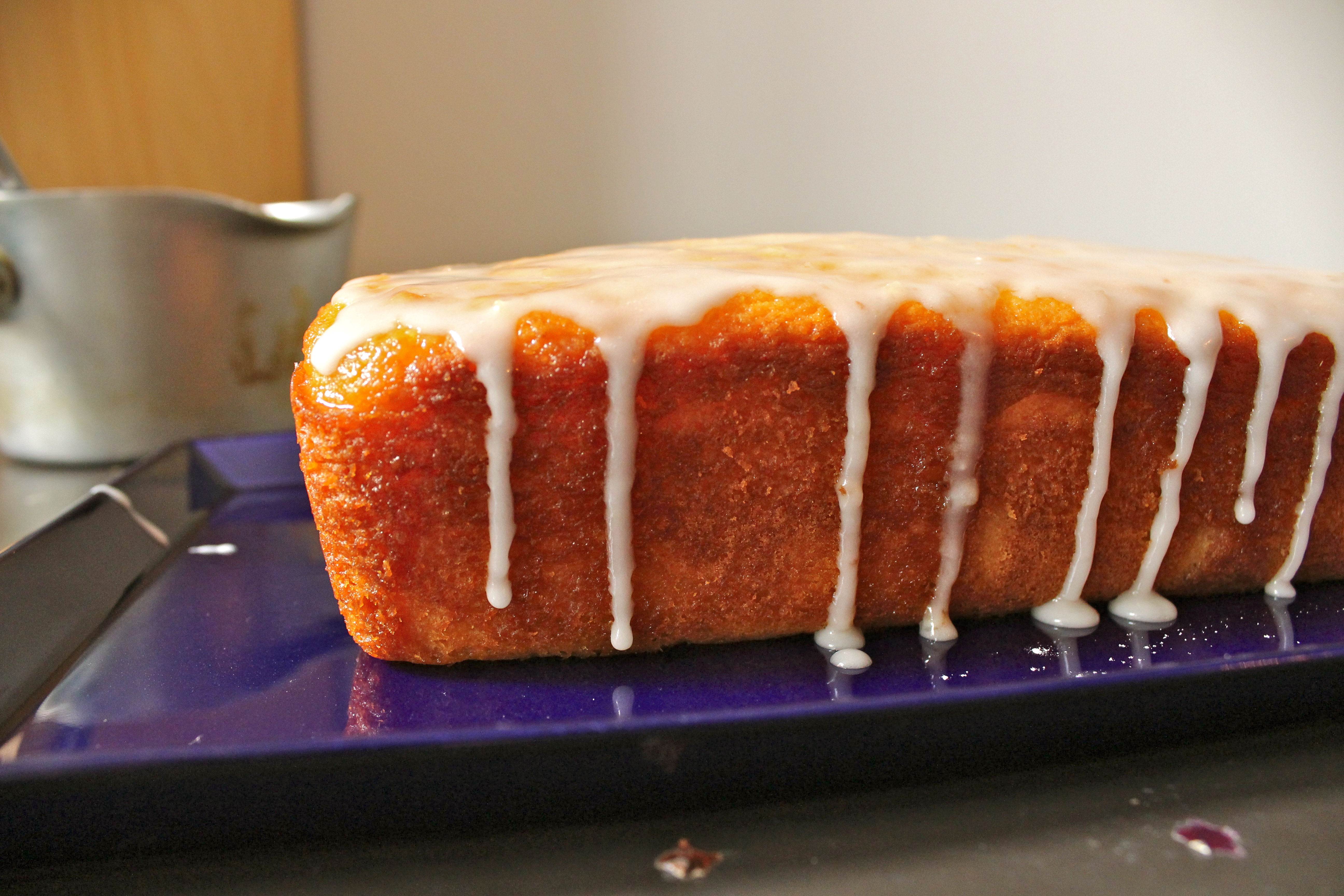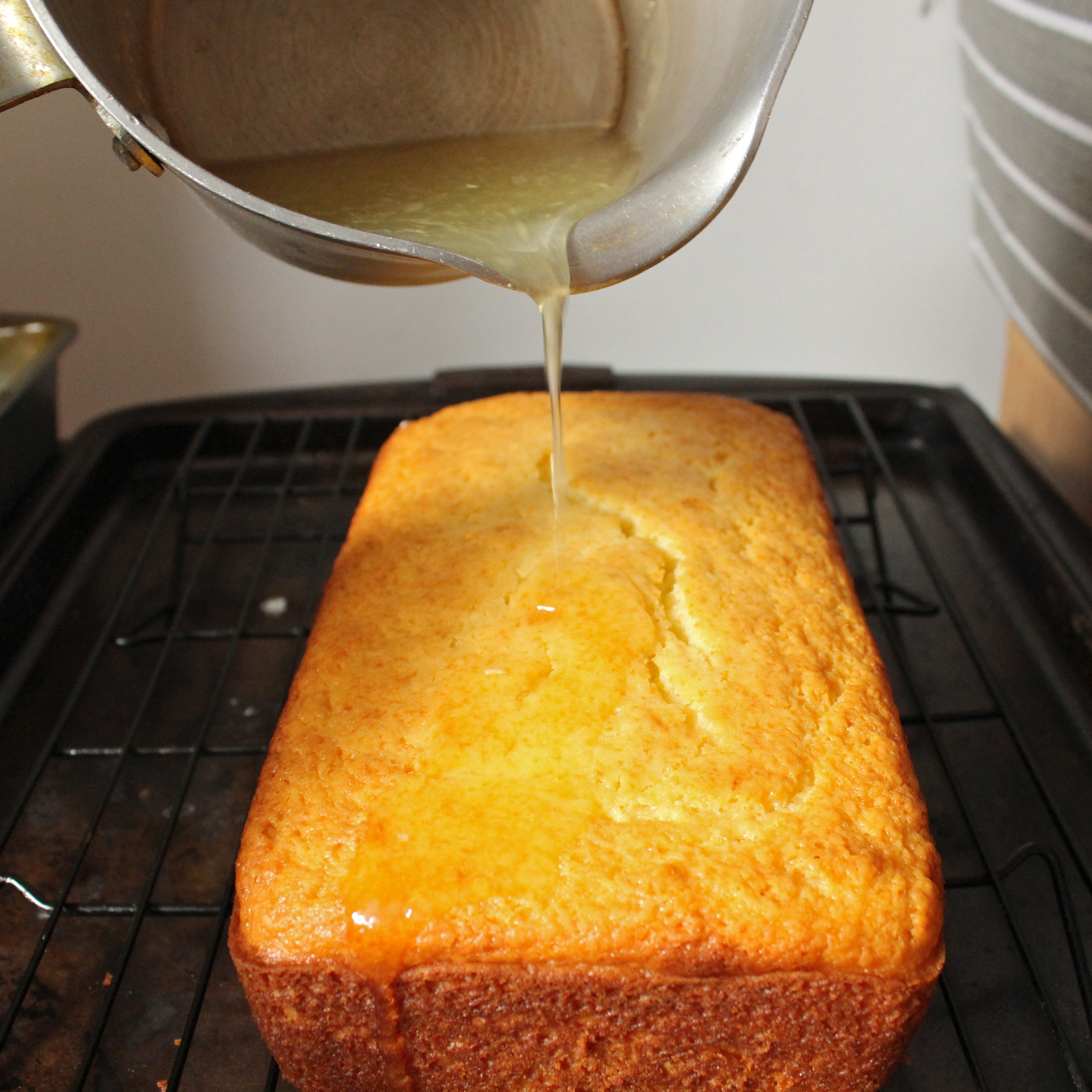 - After the cake is done, let it sit 10 minutes before turning out onto a wire rack. Place the cake and rack over a sheet pan (to catch excess syrup/icing). Dissolve water and sugar in a sauce pan. Poke holes through the top of the cake with a toothpick and drizzle the lemon syrup.