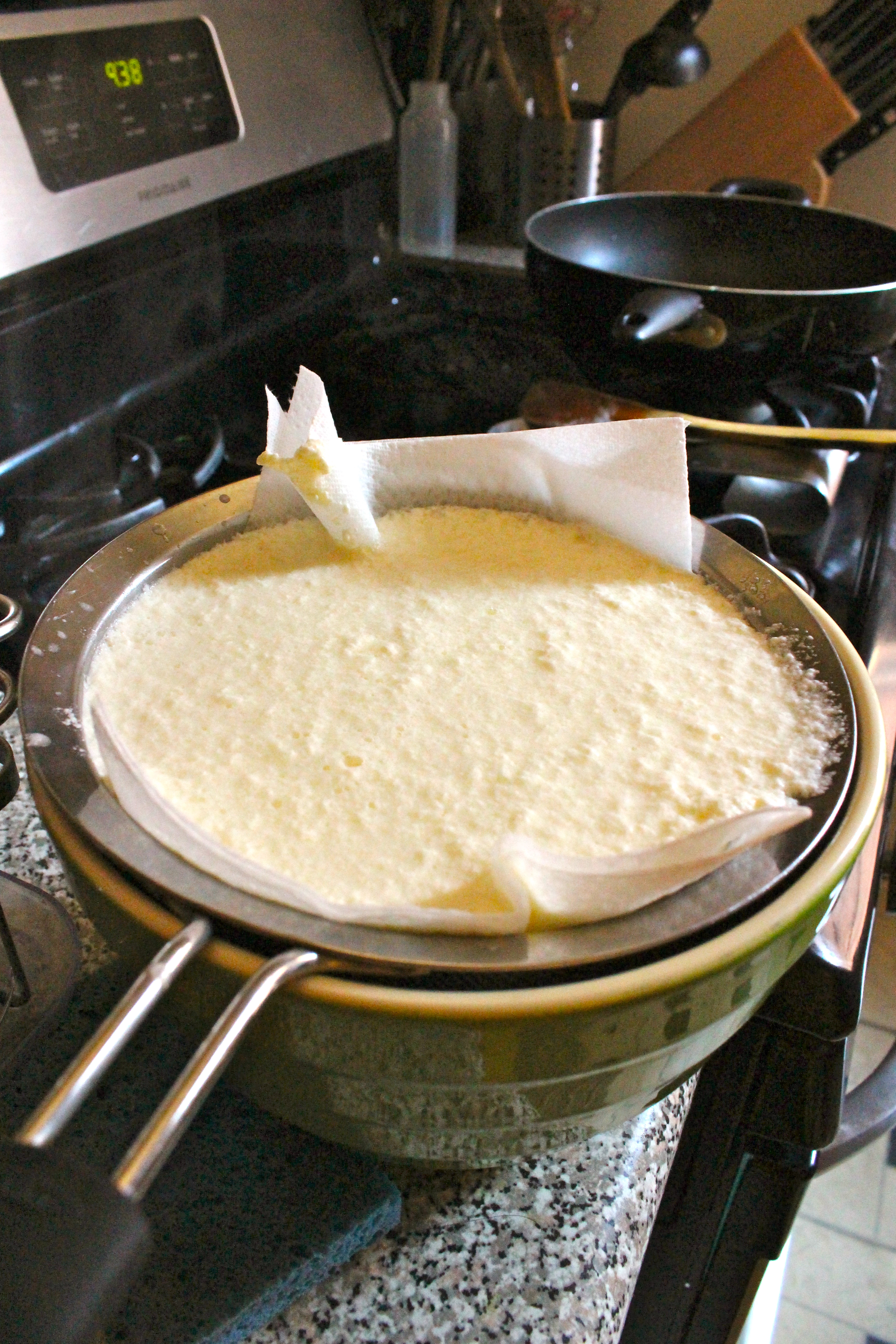 - Place a mesh sieve over a big (preferably deep) and line it with cheesecloth or a paper towel. Carefully pour mixture in and allow the whey to separate from the curds for 20-25 minutes. Voila! You have ricotta cheese.
