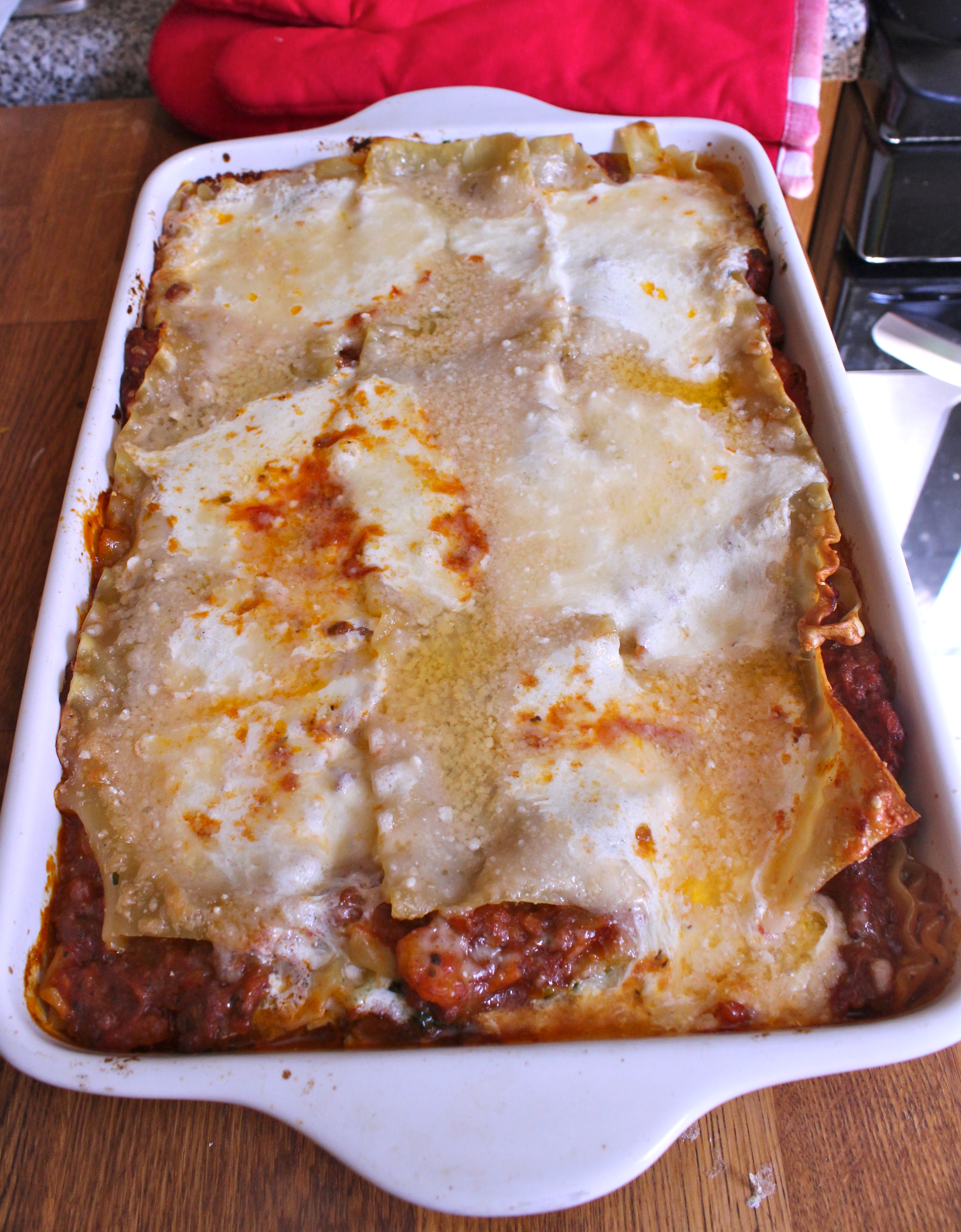 - Assemble the darn thing: preheat oven to 375 degrees Fahrenheit. Add 1/3 of meat sauce to the bottom of a casserole or lasagna dish. Add one layer of lasagna noodles (3 of the traditional barilla noodles). Then add 1/2 of the ricotta/spinach mixture. Top with 3 more noodles. Then add another third of the meat sauce - spreading to distribute evenly. �Top with half of the mozzarella cheese (shredded or sliced). Top with 3 more lasagna noodles. Add remaining spinach/ricotta mixture. Add 3 more noodles. Top with remaining meat sauce. Add 3 final noodles. Top with remaining mozzarella cheese and grated parmesan.