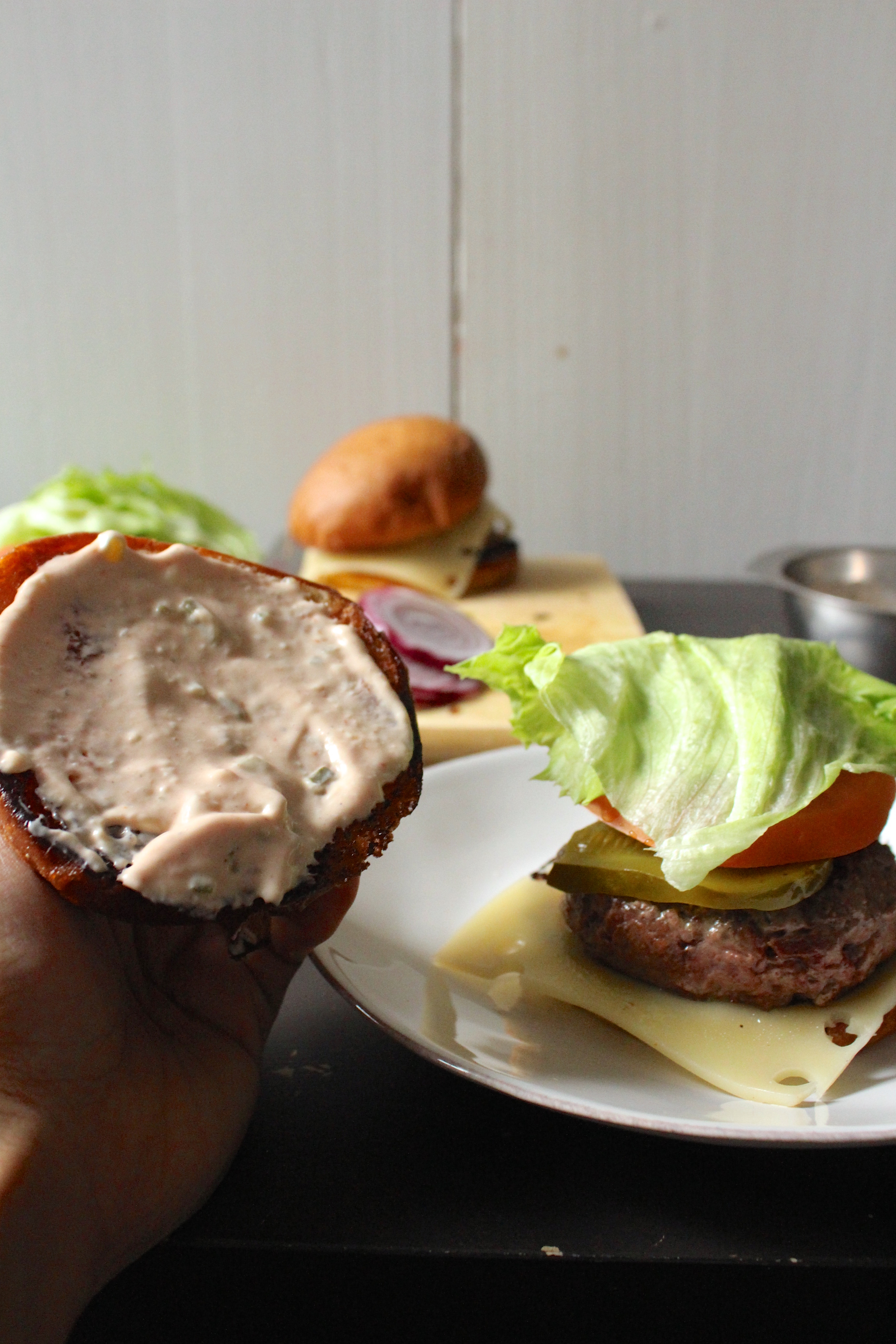 - Make the sauce: combine mayo, ketchup, hot sauce, chopped pickle, salt & pepper in a small bowl. Smear sauce on both sides of the bun. Add burger and layer with whatever ingredients you like, I listed the classic toppers above but feel free to substitute caramelized onions and saut�ed mushrooms or avocado and cilantro. The choices are endless!