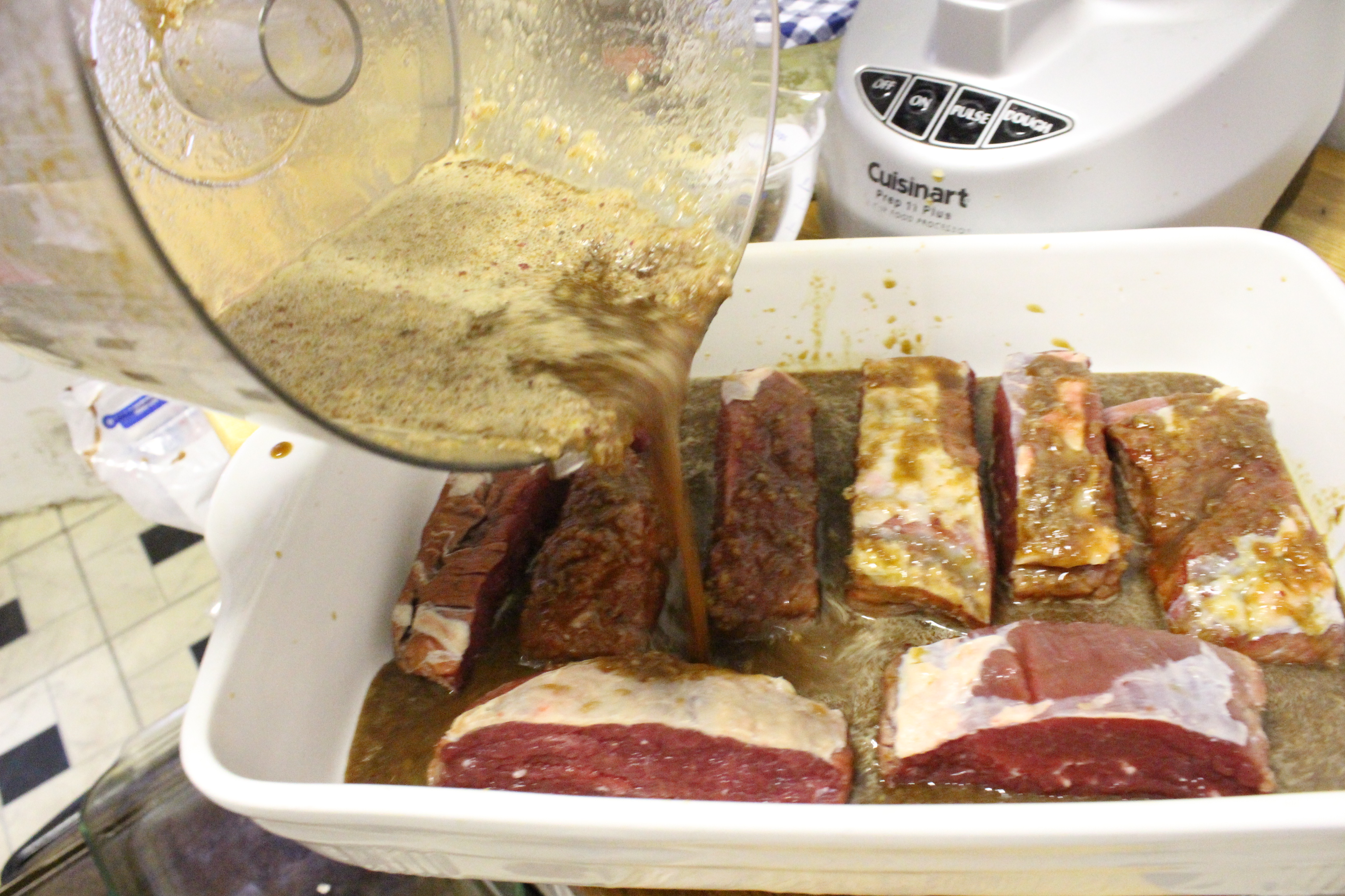 - Cut the short ribs into 1 1/12 to 2 in thick strips. Lay across a baking dish and drizzle the sauce over all the pieces.