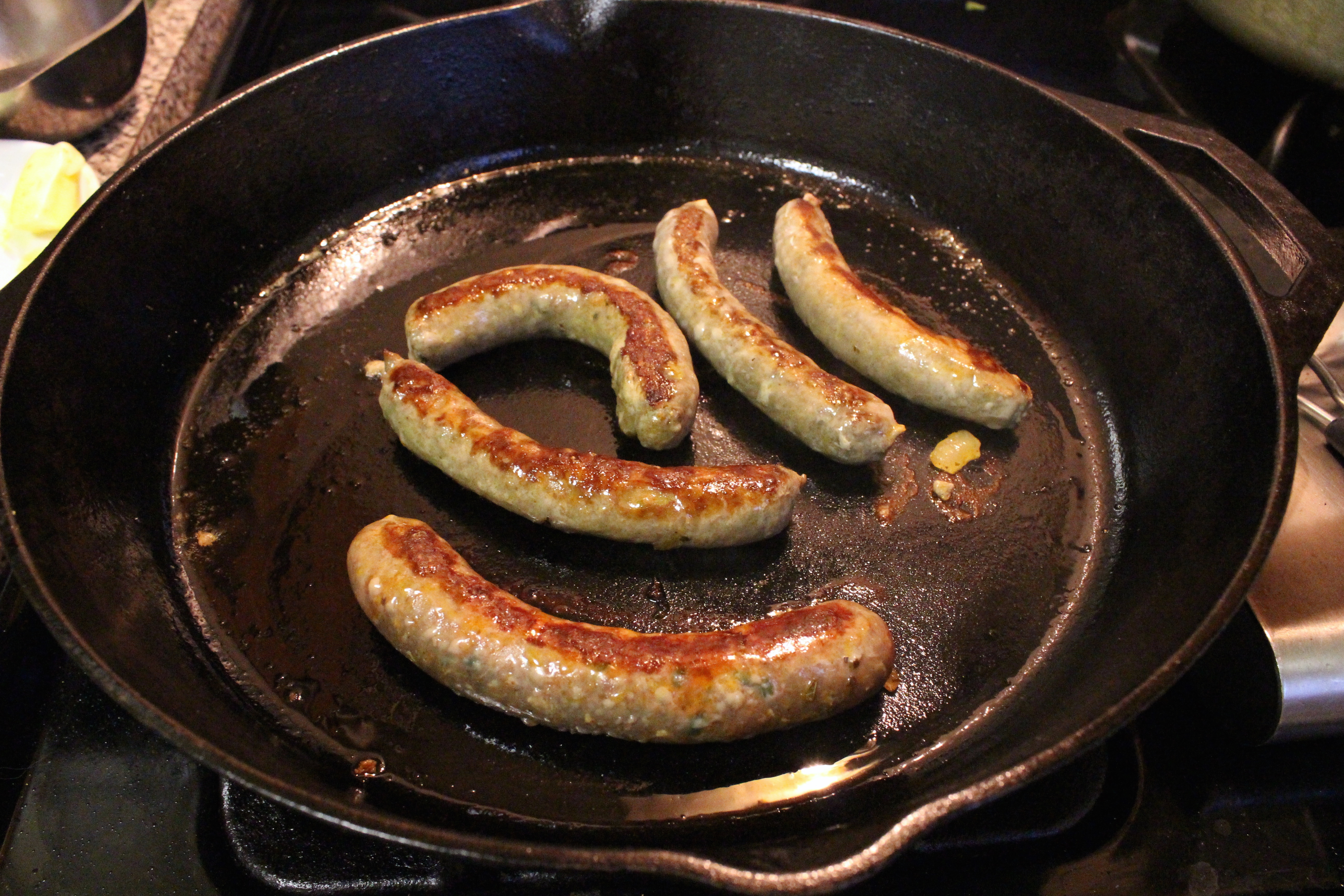 - In the same skillet, lightly grease with oil or non stick cooking spray. Add the sausages and do not move for 3-4 minutes (3 minutes for a thinner sausage, 4 for a thicker one). After the allotted time, flip and cook for an additional 3-4 minutes.