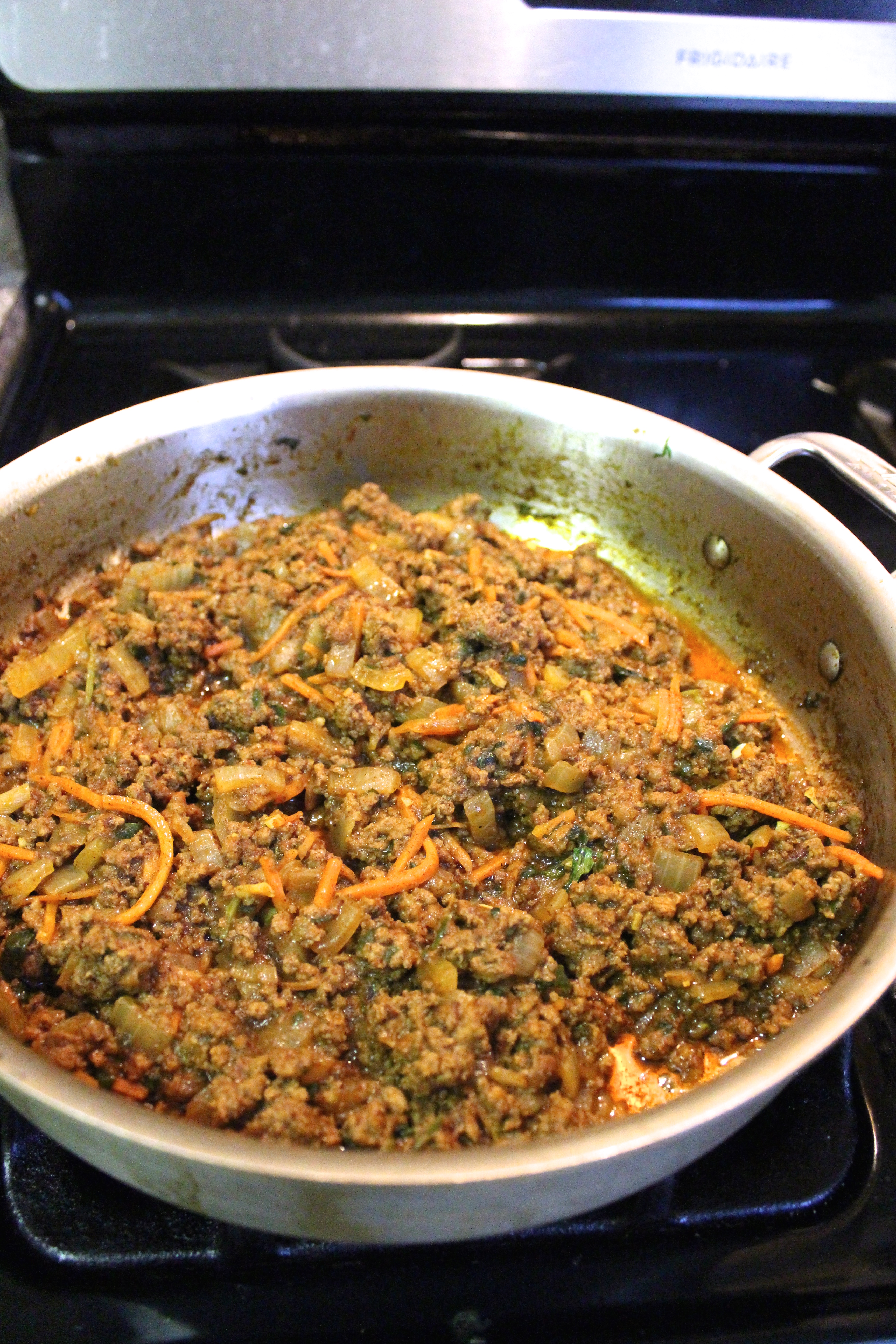 - In a large skillet, heat oil over medium high heat. Add beef, onion and garlic. Cook until meat browns, 7-8 minutes, breaking up the beef with a wooden spoon. Keep scraping up the browned bits from the bottom of the pan. Add carrots, parsley/cilantro, tomato paste, spices and salt. Saute for 2 minutes. Add water and cover with a lid. Cook until liquid evaporates and carrots are tender.