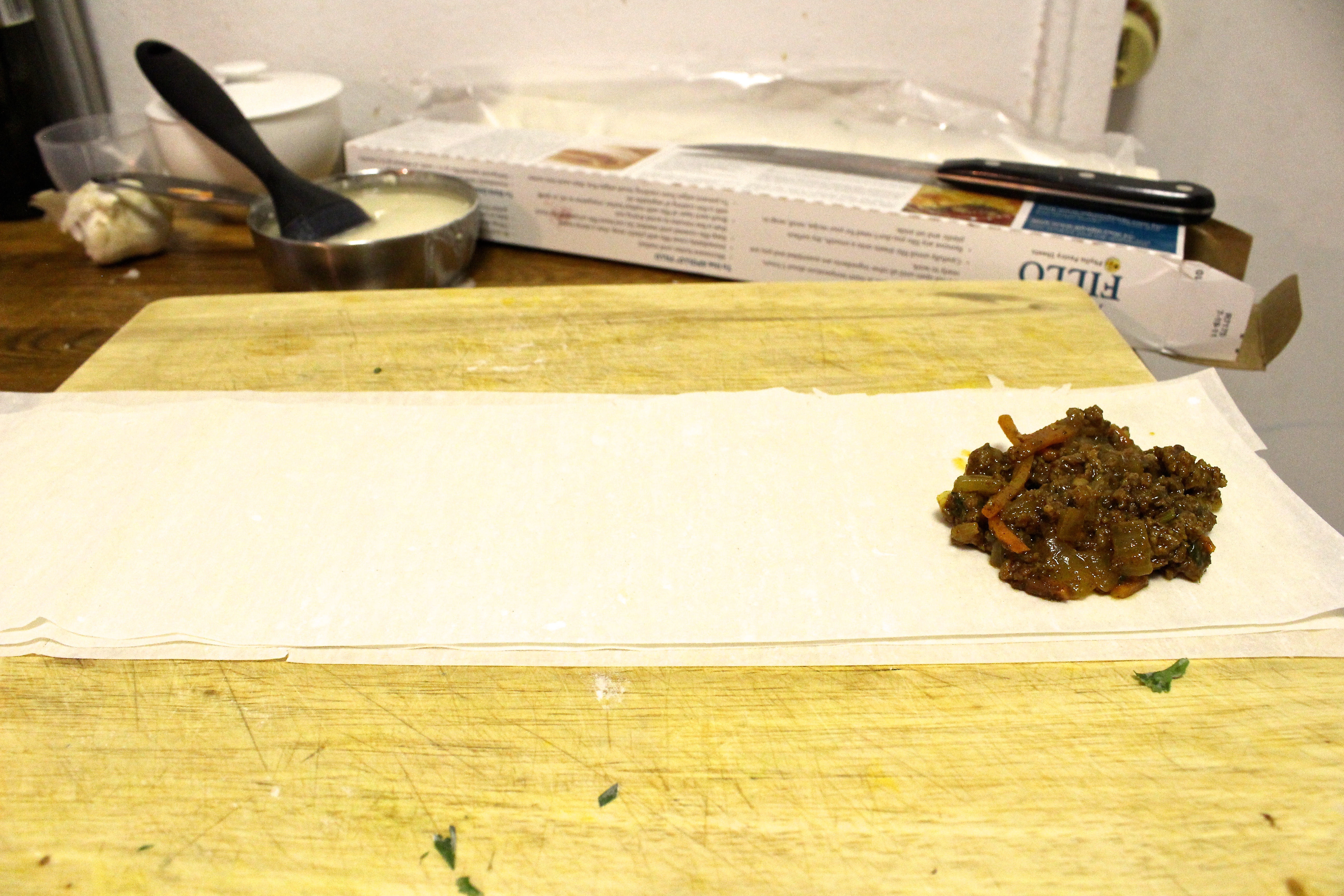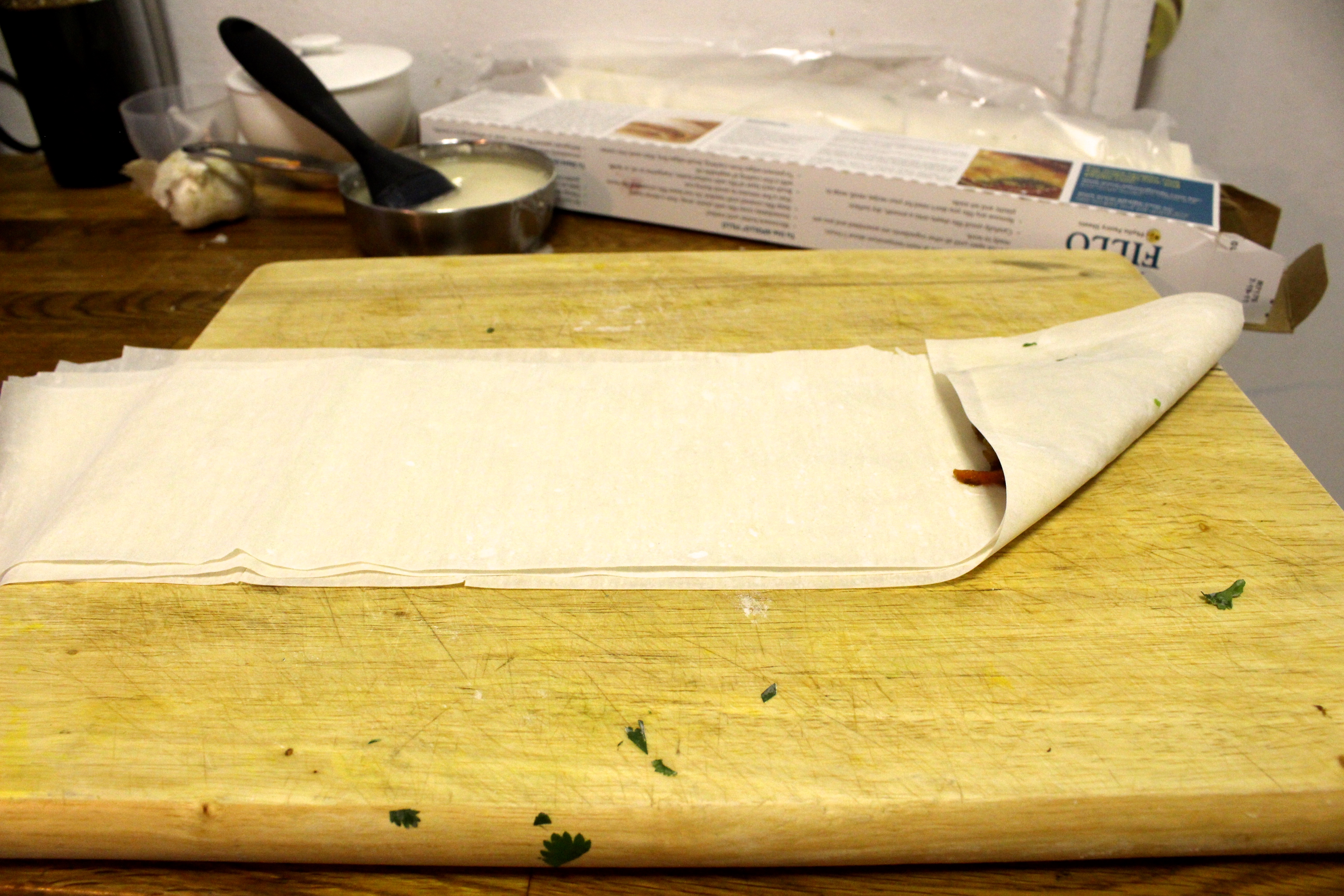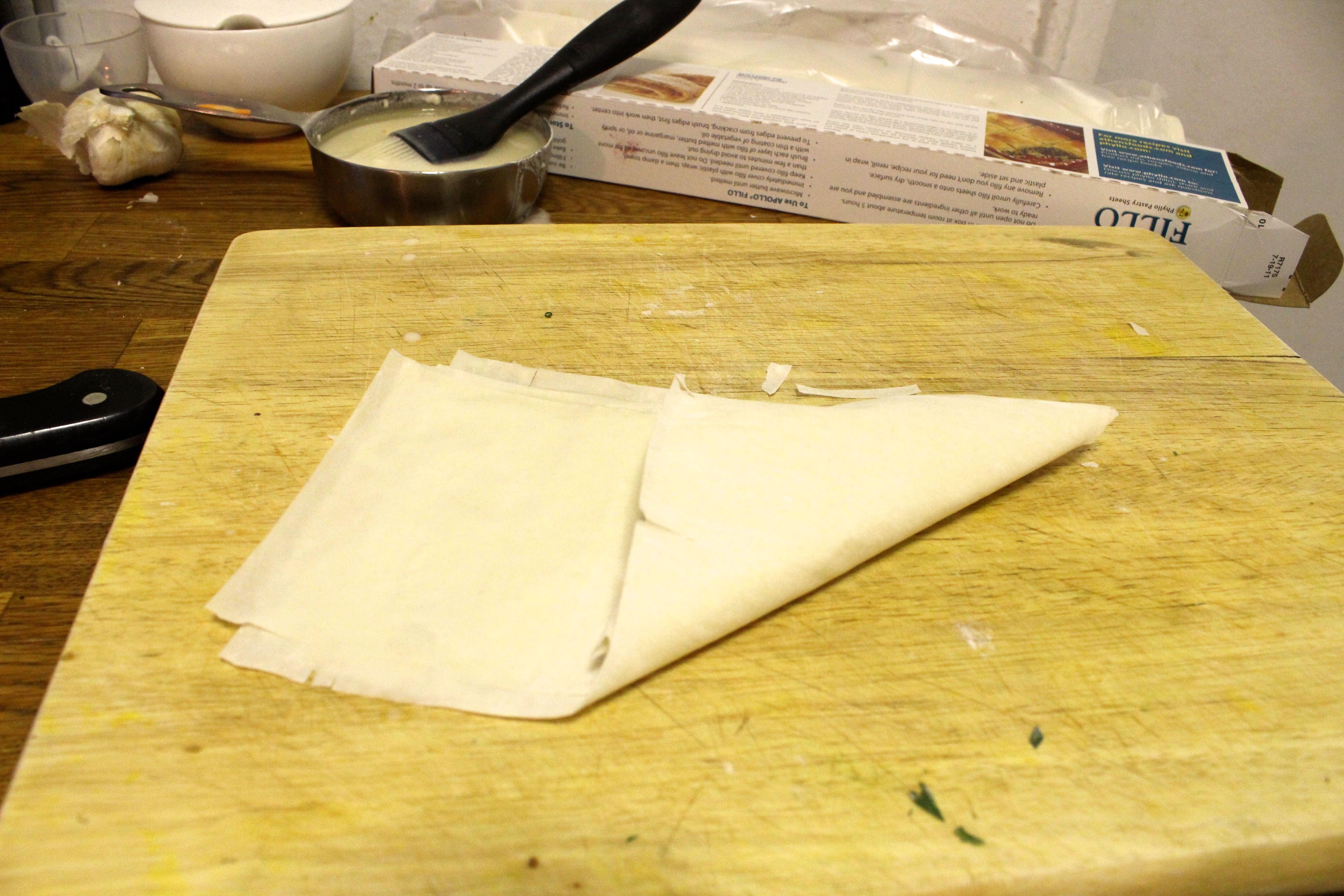 I kind of winged it with the wrapping. I recalled some filo wrapping directions for Spanakopita ages ago and tried to apply it here. I tried cutting a single sheet in half and folding - the results were way too big. I tried thirds - still too big. Folding a sheet in half, and cutting it down the middle made the perfect size and thickness.