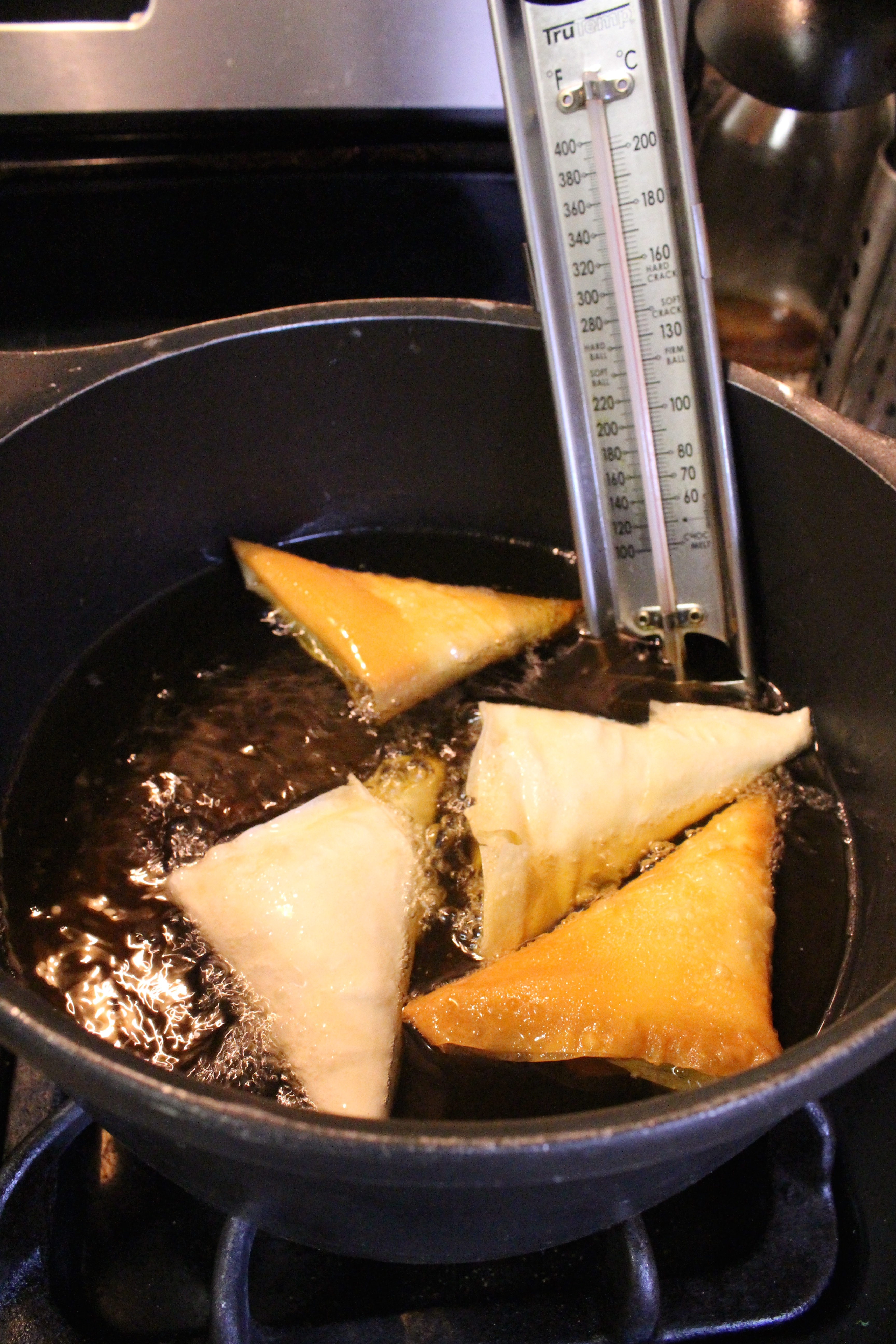 �A long time ago, I was downright terrible at frying things. I would add things to the oil before it heated up properly. Or I wouldn’t regulate the heat carefully so after the first batch or two things would just go BAM - overly browned and out of commission. But then - then I got a candy thermometer. A wonderful little kitchen tool that helps with my caramels as much as my samosas (truth be told - this is the first time I’ve made them!).