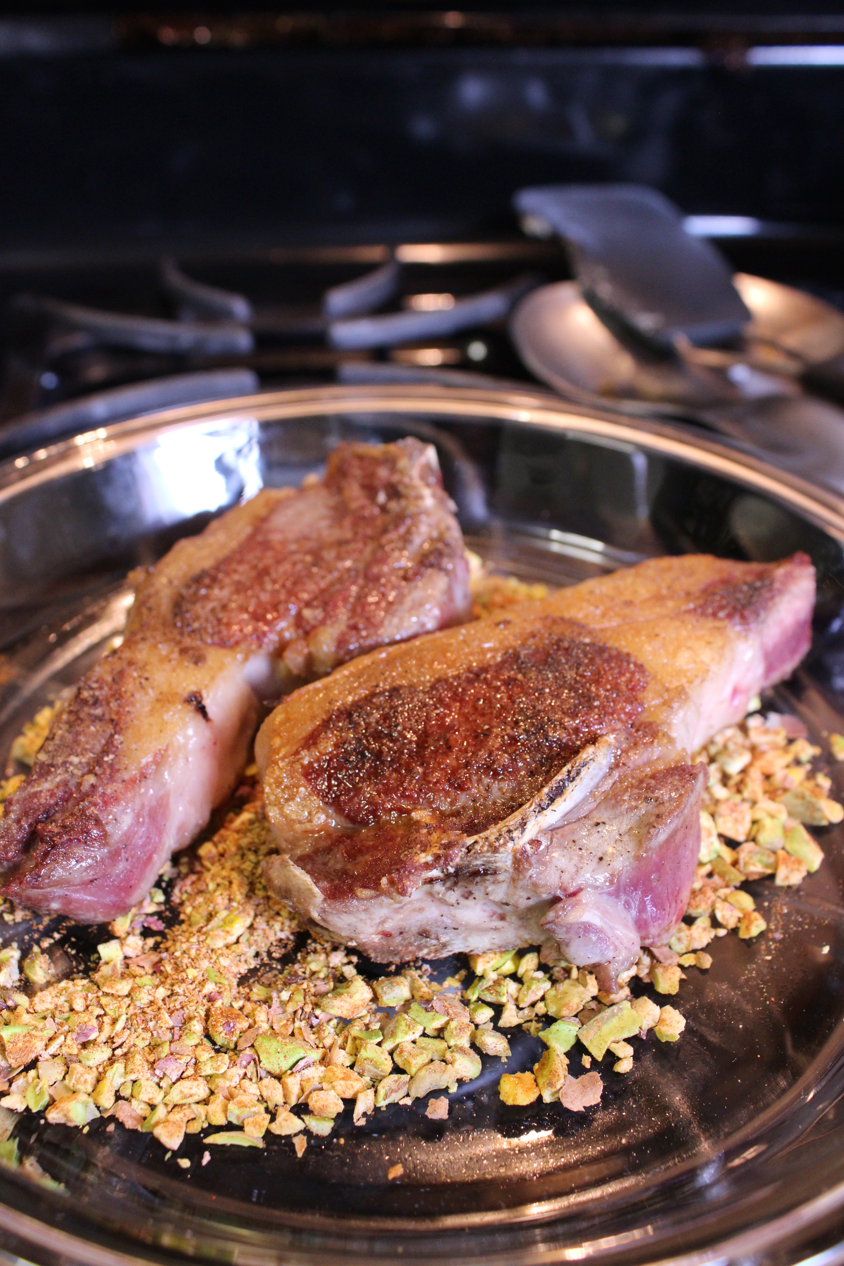 I was lucky I had just enough pistachios left over. You can bet that I was shelling them there were two bodies hovering around me picking them out of the bowl. It worked�because I was working with such a small batch (the recipe was written for 6, I had just two lamb chops). And contrary to the directions in the recipe, I crushed the pistachios with a rolling pin instead of a food processor. Does anyone else find it a huge pain in the butt to clean the food processor? Sure, some spices made its way out of the ziploc bag as I banged out the mix, but�doing so over a cutting board helped rescue some escapees.