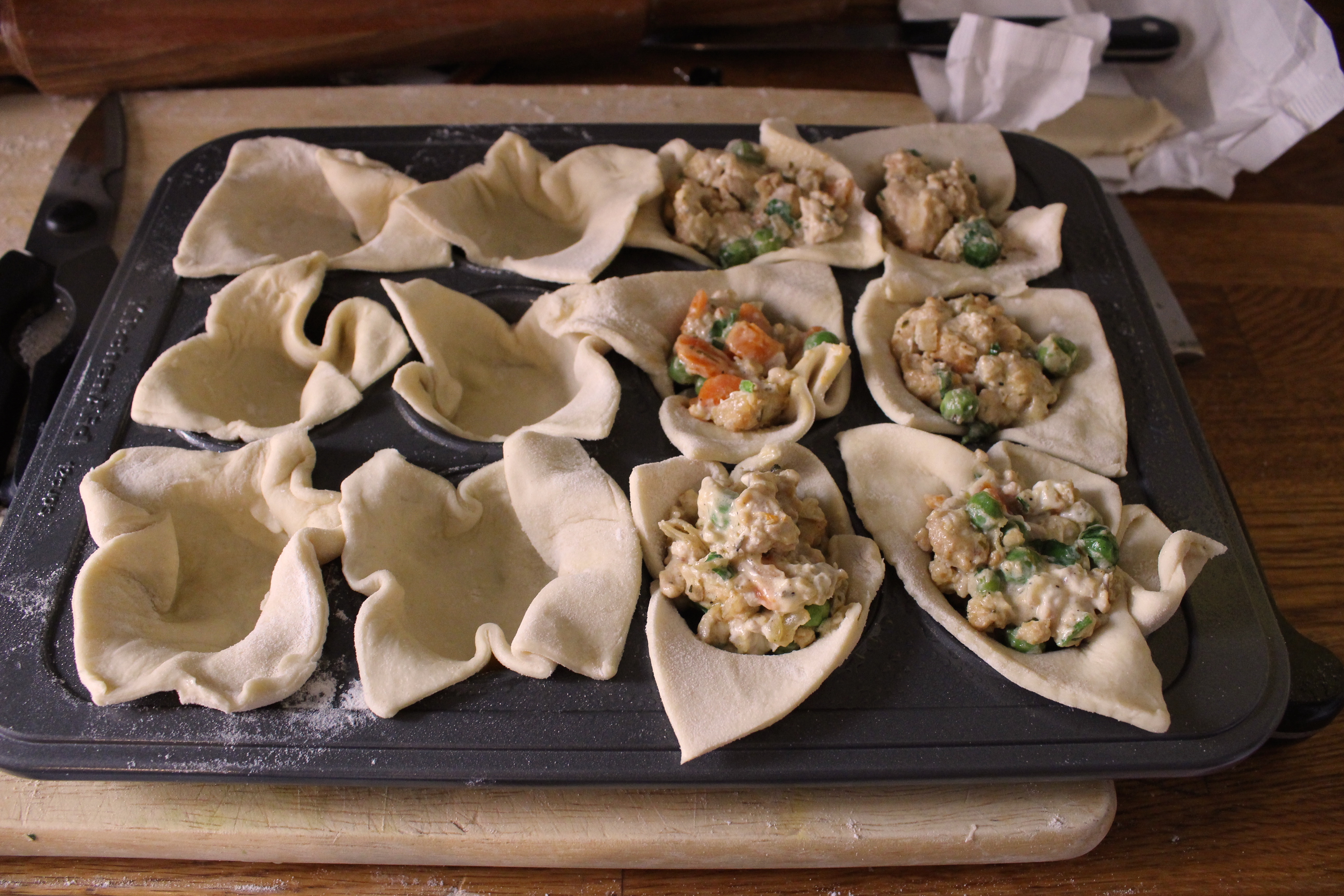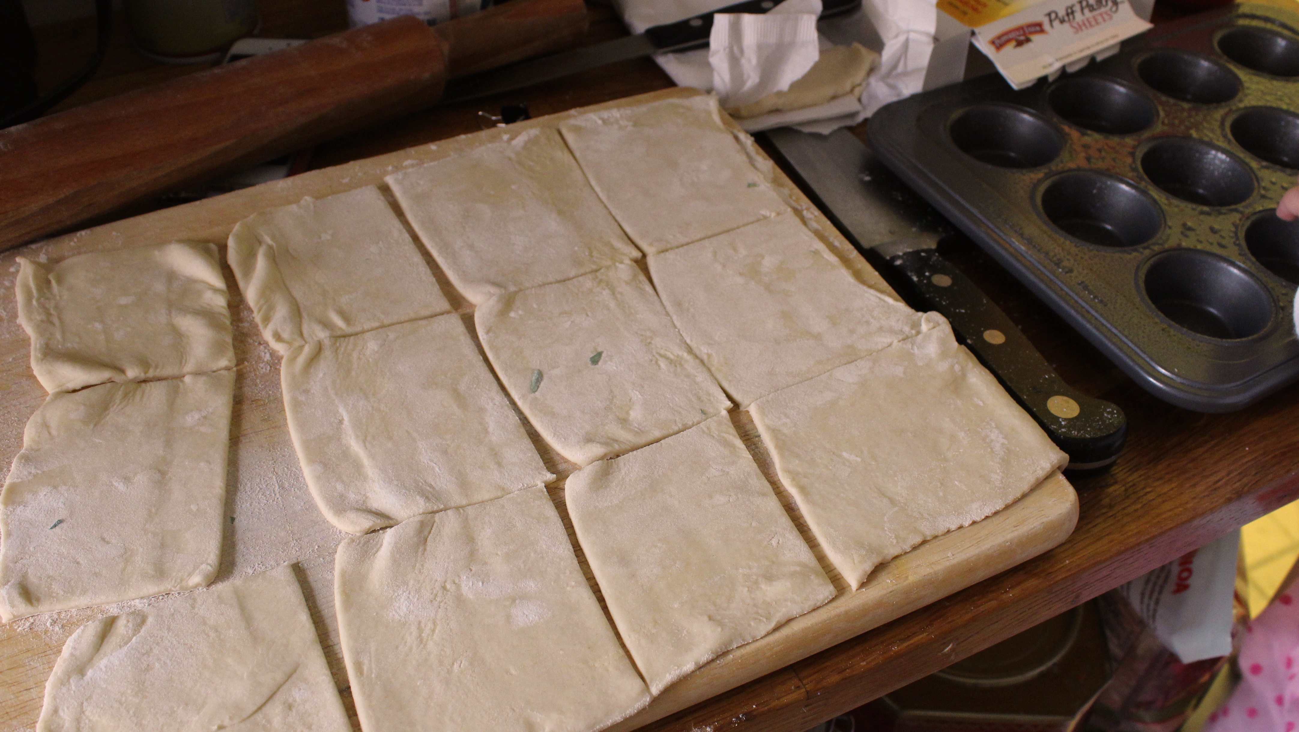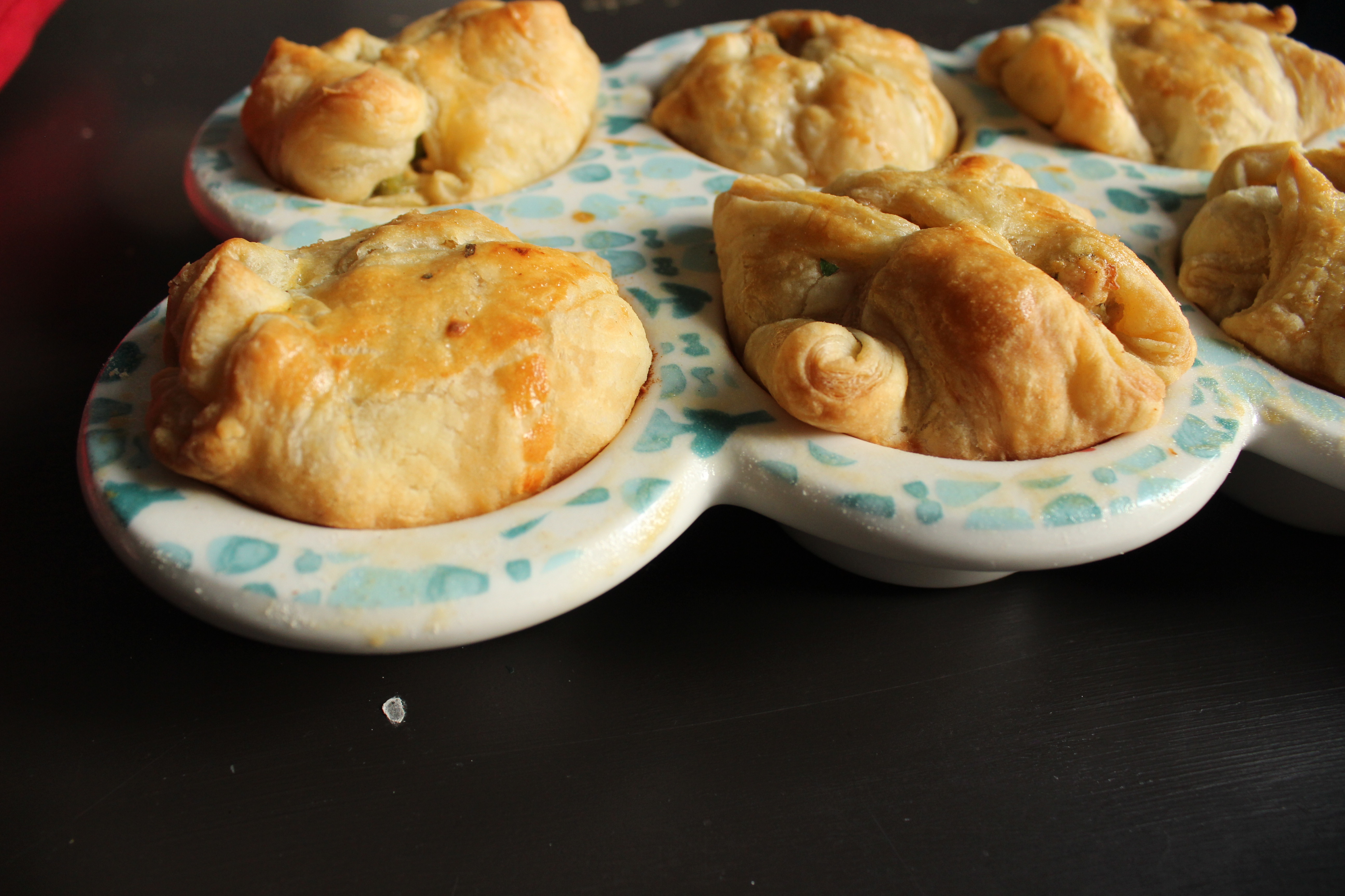 - On a floured surface, roll out one sheet of the puff pastry until it's slightly larger than the area of the muffin pan. Using a sharp knife, cut out 6 or 12 rectangles, according to the size of your muffin pan. You should get 12 pot pies out of a regular muffin pan, or 24 mini pot pies from a mini muffin pan.�Fill each gap with a rectangle of puff pastry, with the corners hanging extending beyond the borders a bit. Add 1 to 2 tbsp of the meat mixture and fold over the corners to cover as much as possible. Do this for all the rectangles. Brush each one with the egg and bake in the preheated oven for about 18-22 minutes. Tops should be golden when done.