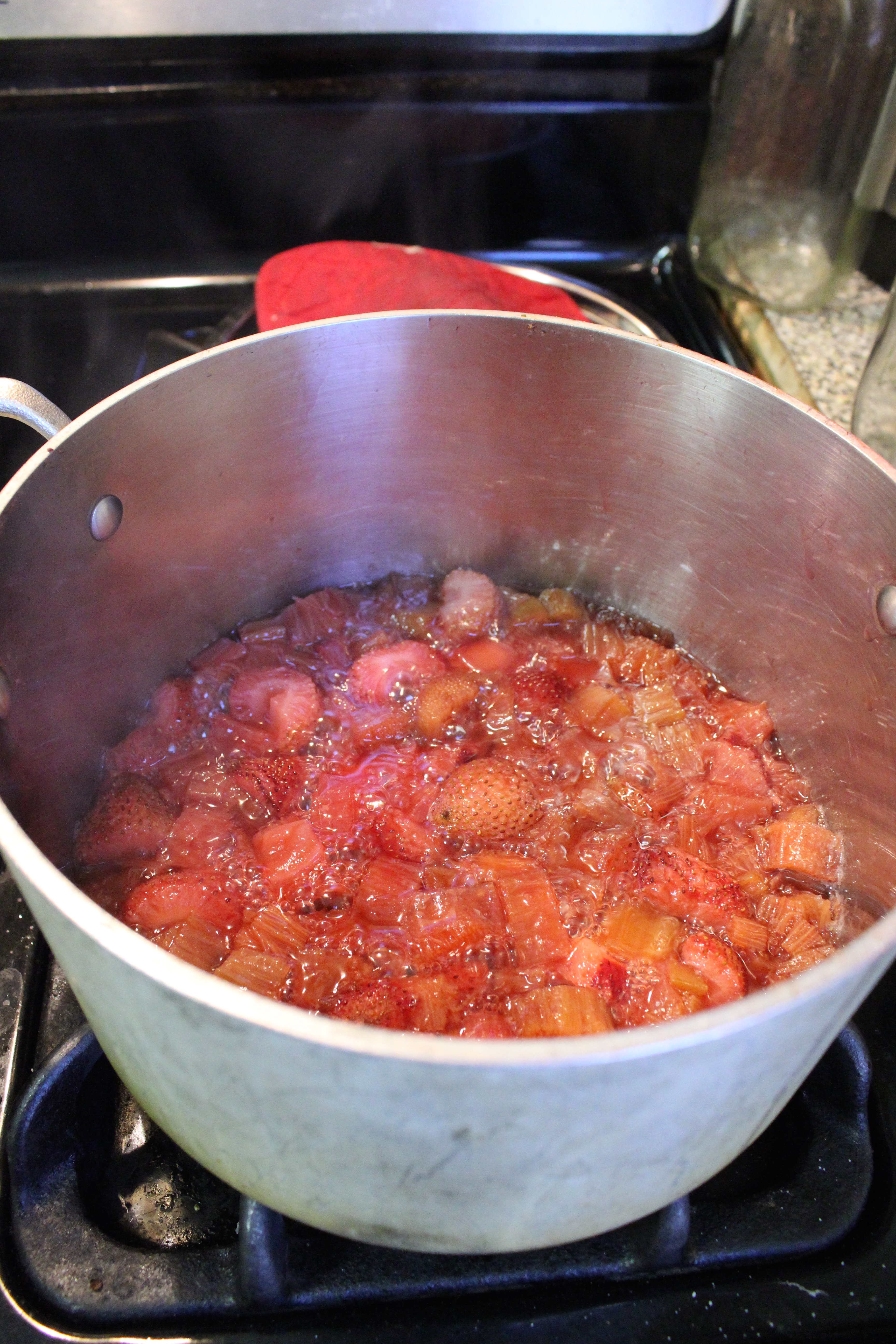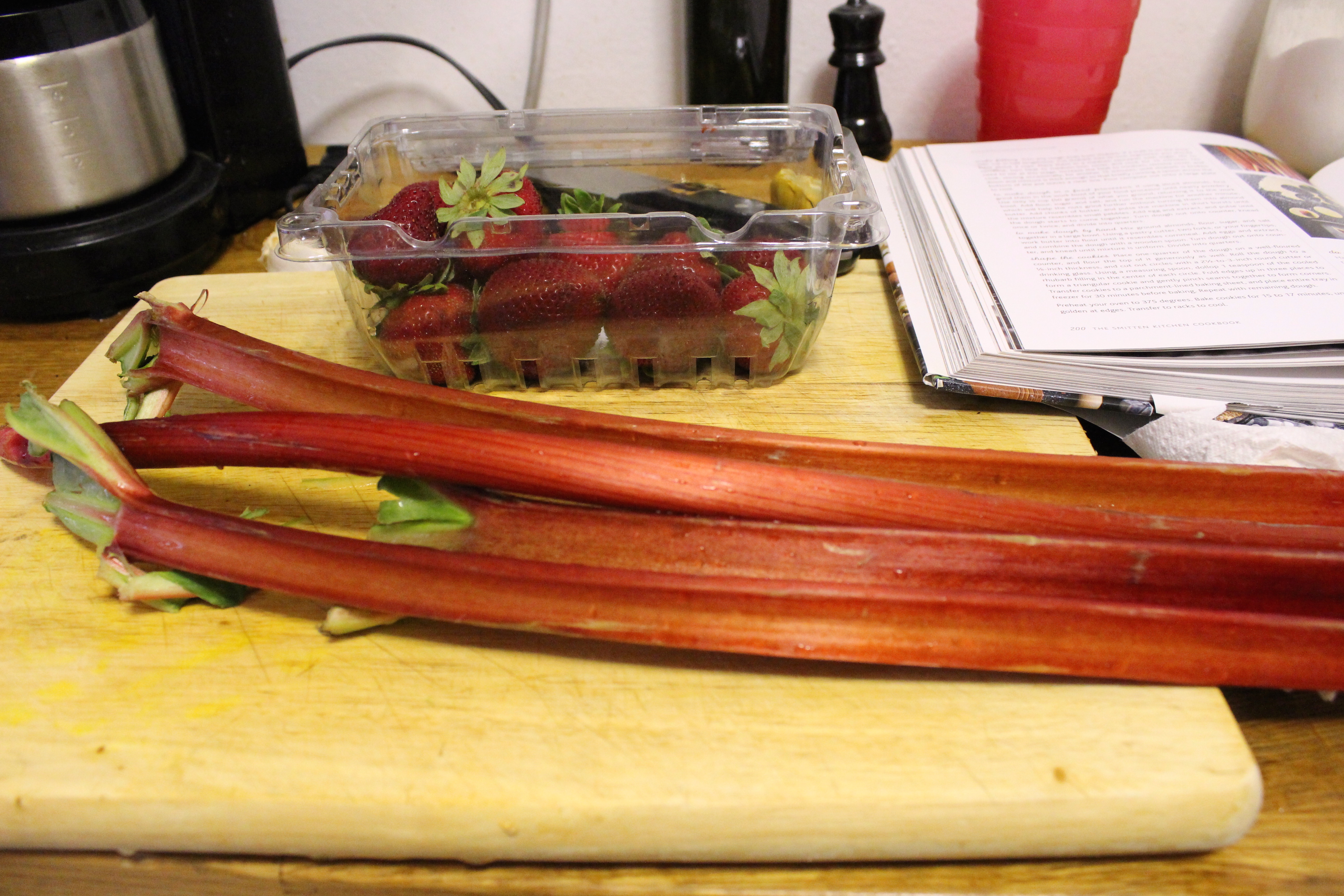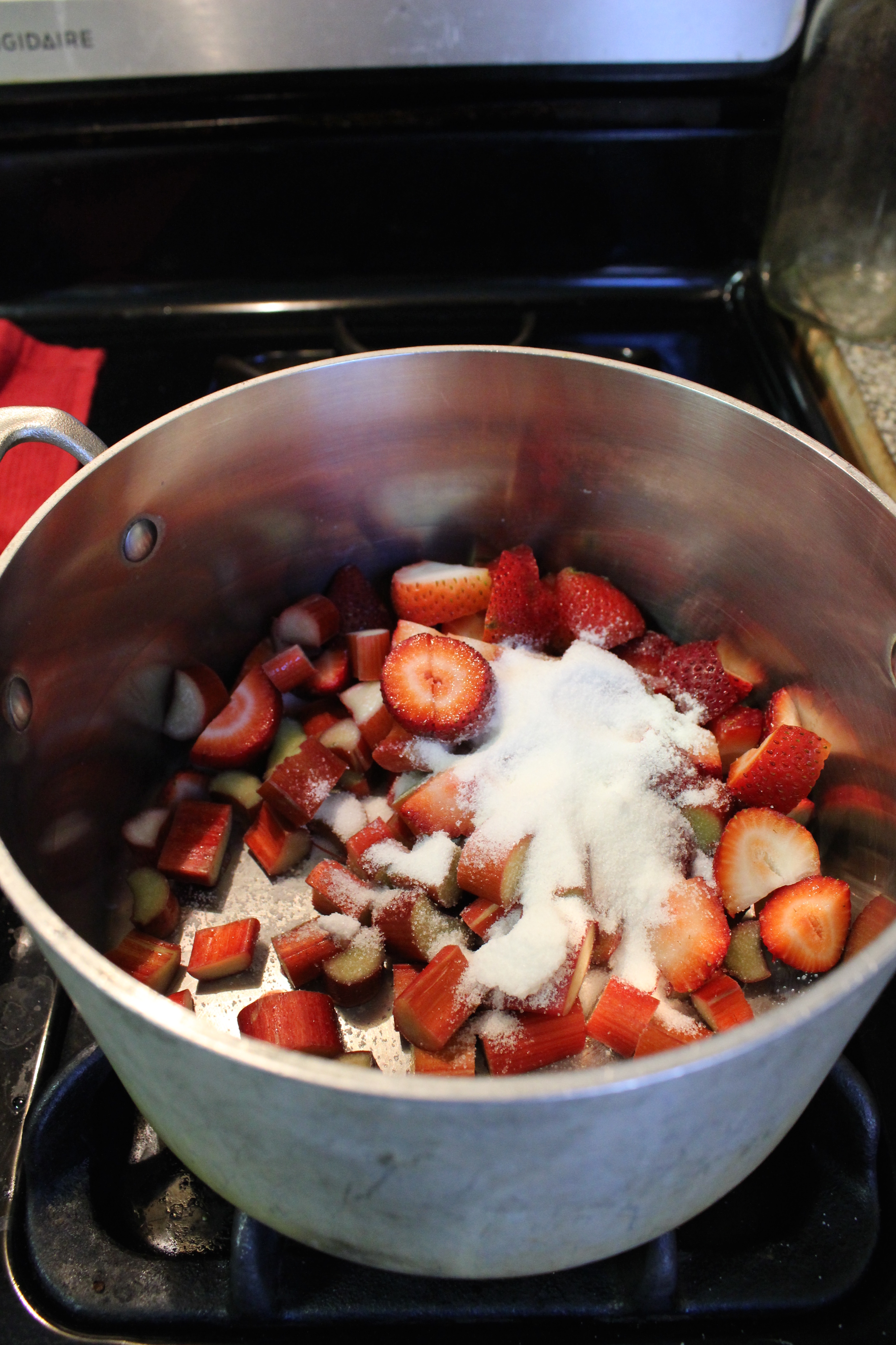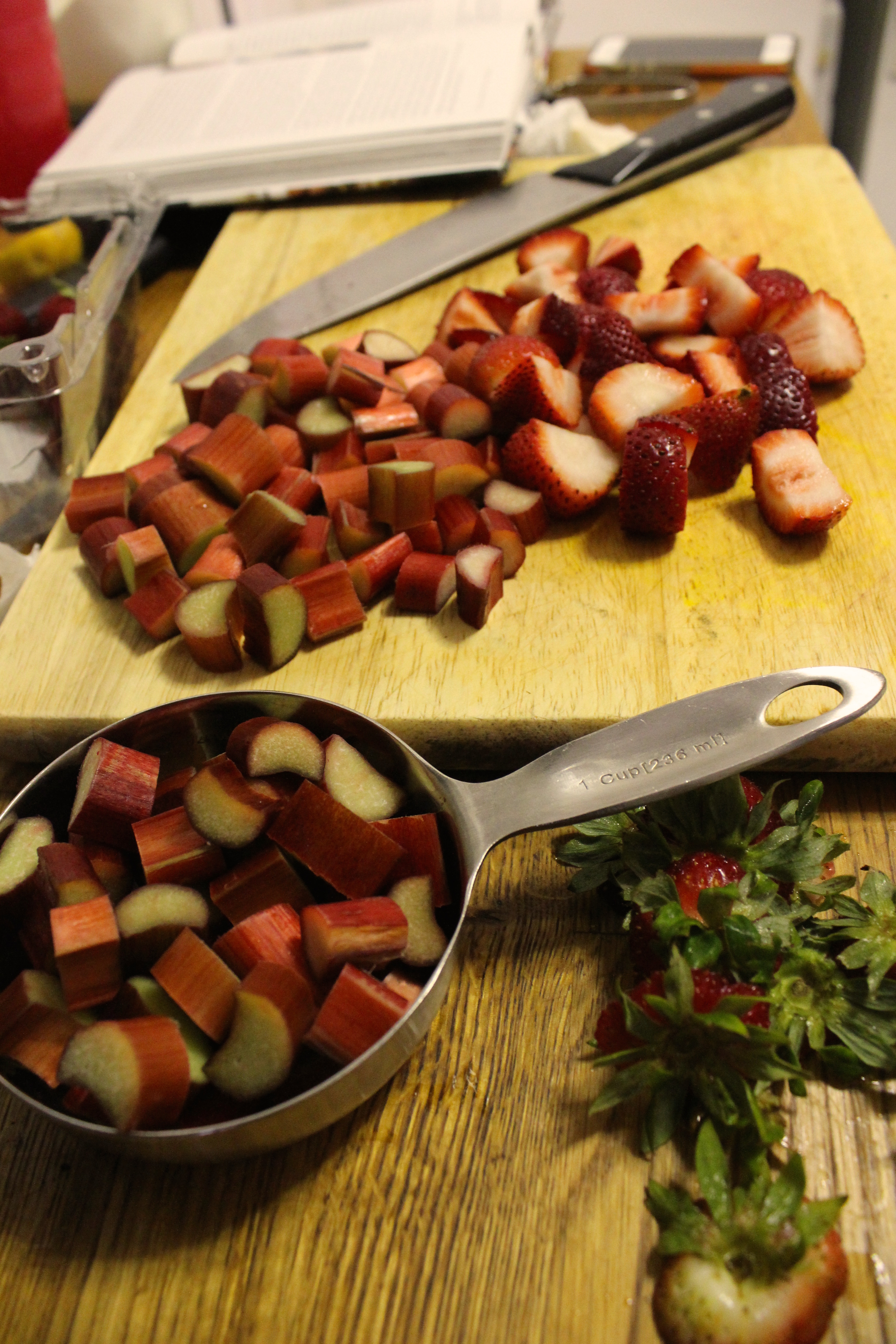 - 3 cups chopped rhubarb and strawberries (I used two cups rhubarb, one cup strawberries. Cut off the leaves and any tough parts of the rhubarb)