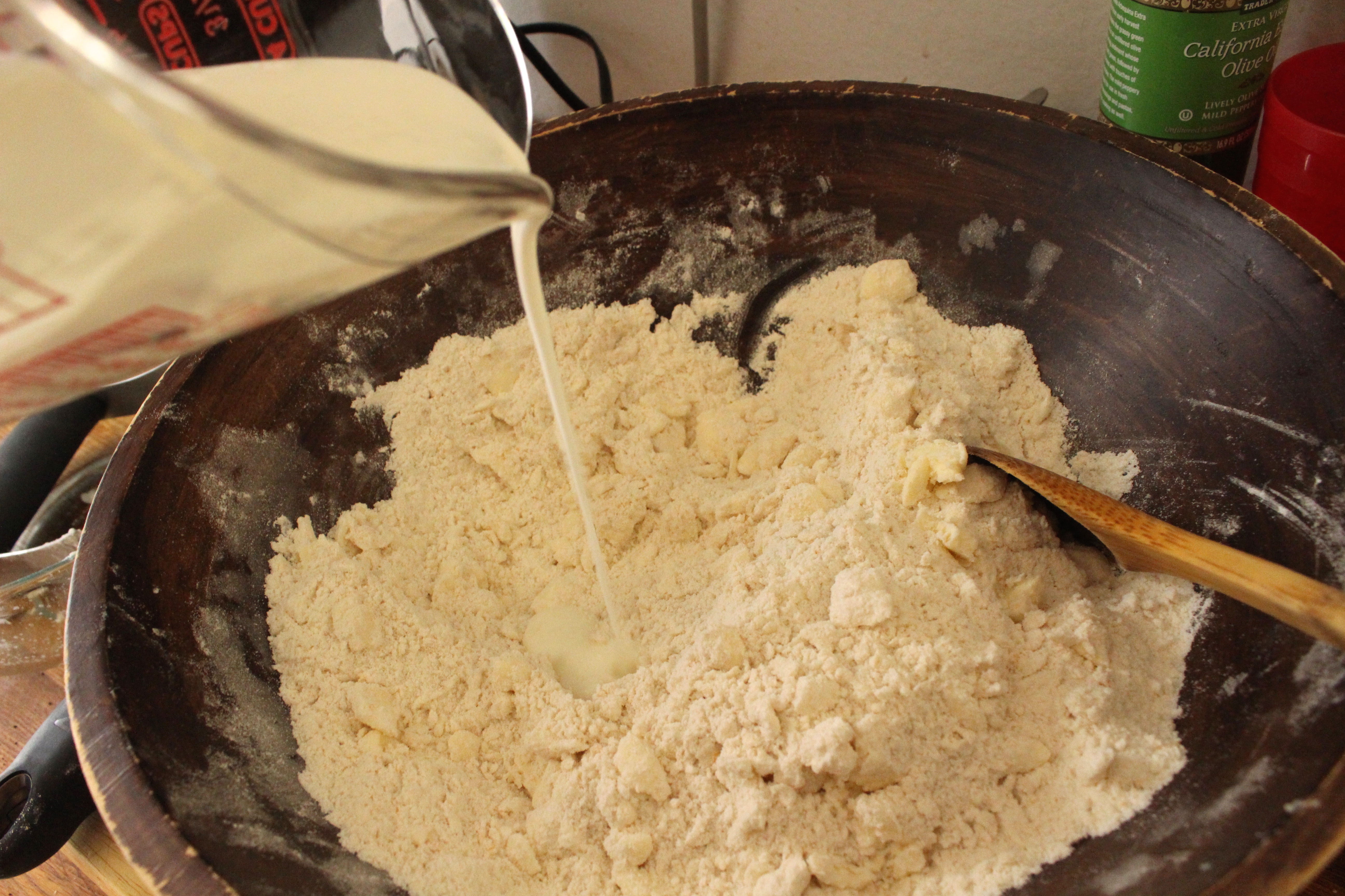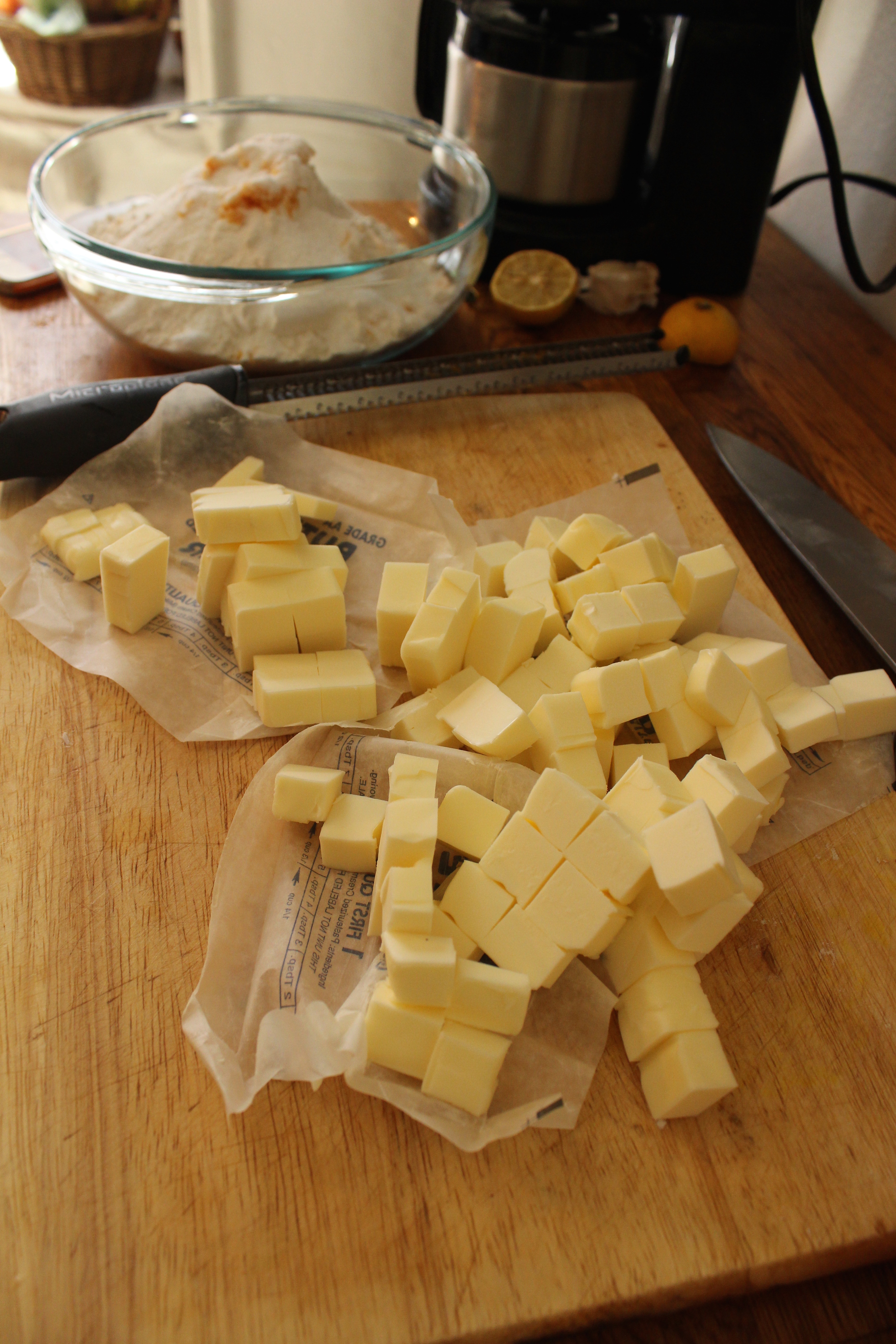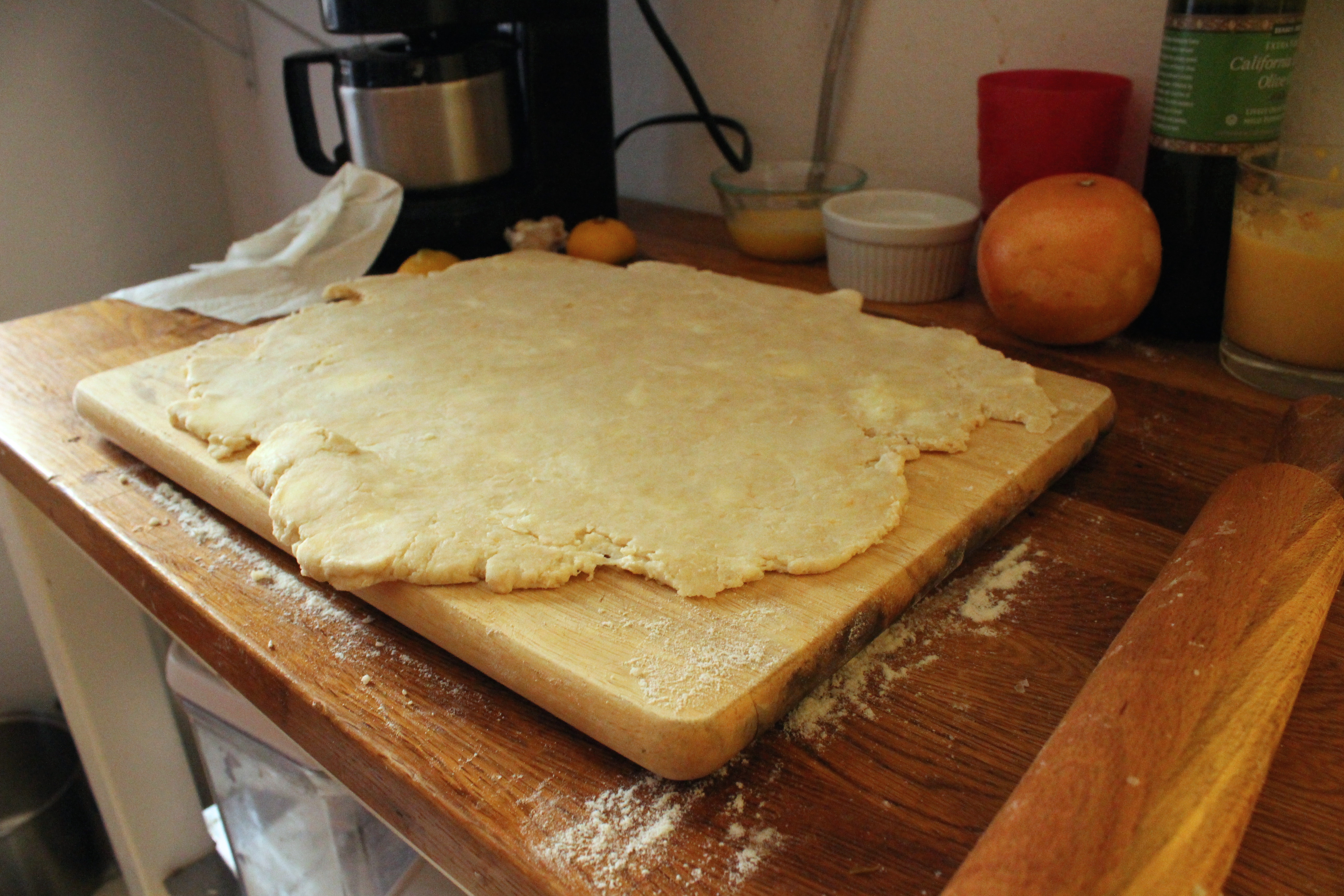 - Make the dough: mix the flour, citrus zest, sugar and salt in a large bowl with a whisk. Add the butter and work with a pastry blender, fork or your fingers until you have pea sized bits of flour encrusted butter running throughout. Then, slowly add the buttermilk and mix with a spatula or wooden spoon to incorporate. When all the buttermilk has been added, knead a few times with your hand to get it in the shape of the ball. Divide the ball in four�and flatten each into a disk. Wrap with plastic wrap and stick them in the fridge for at least 30 minutes.