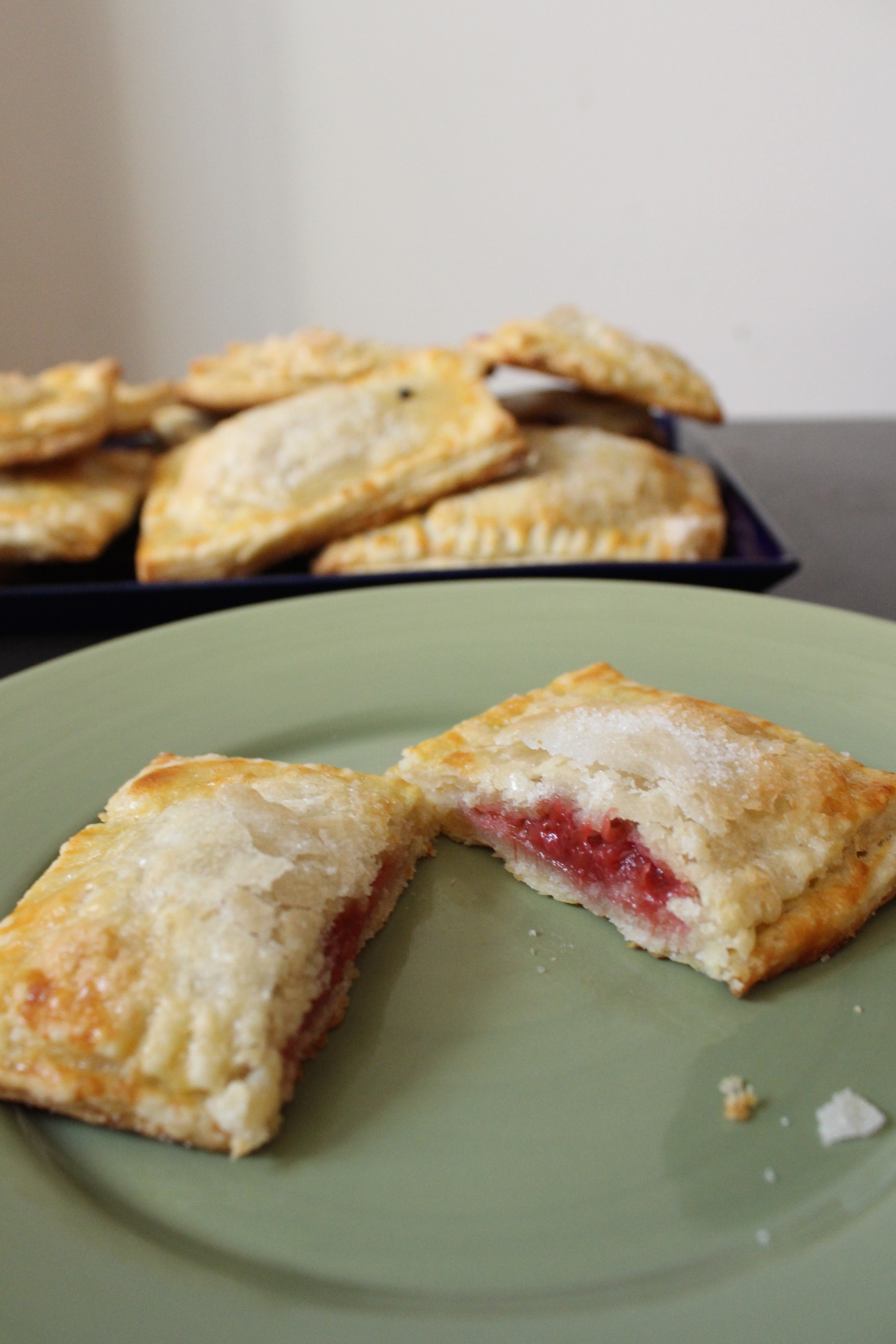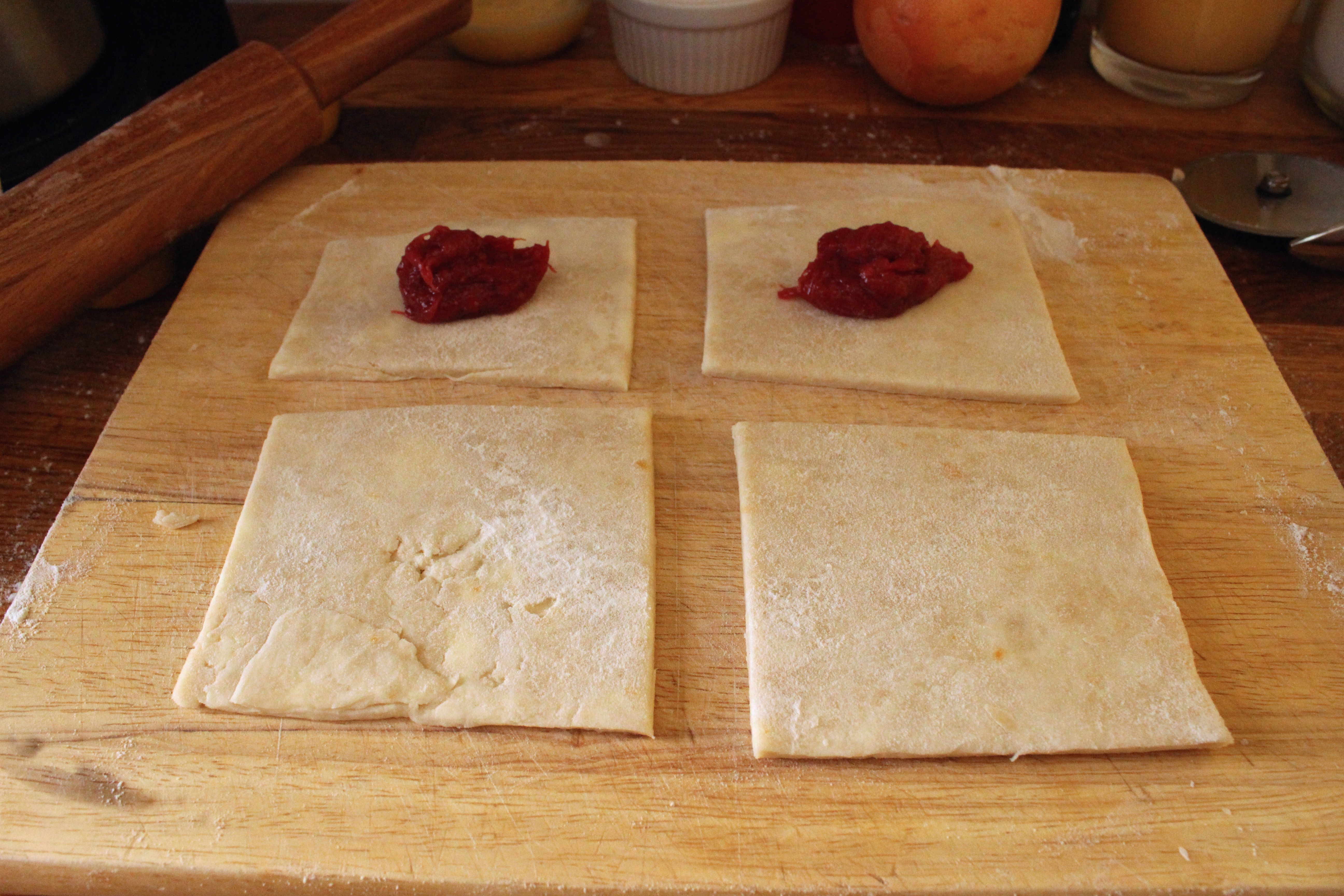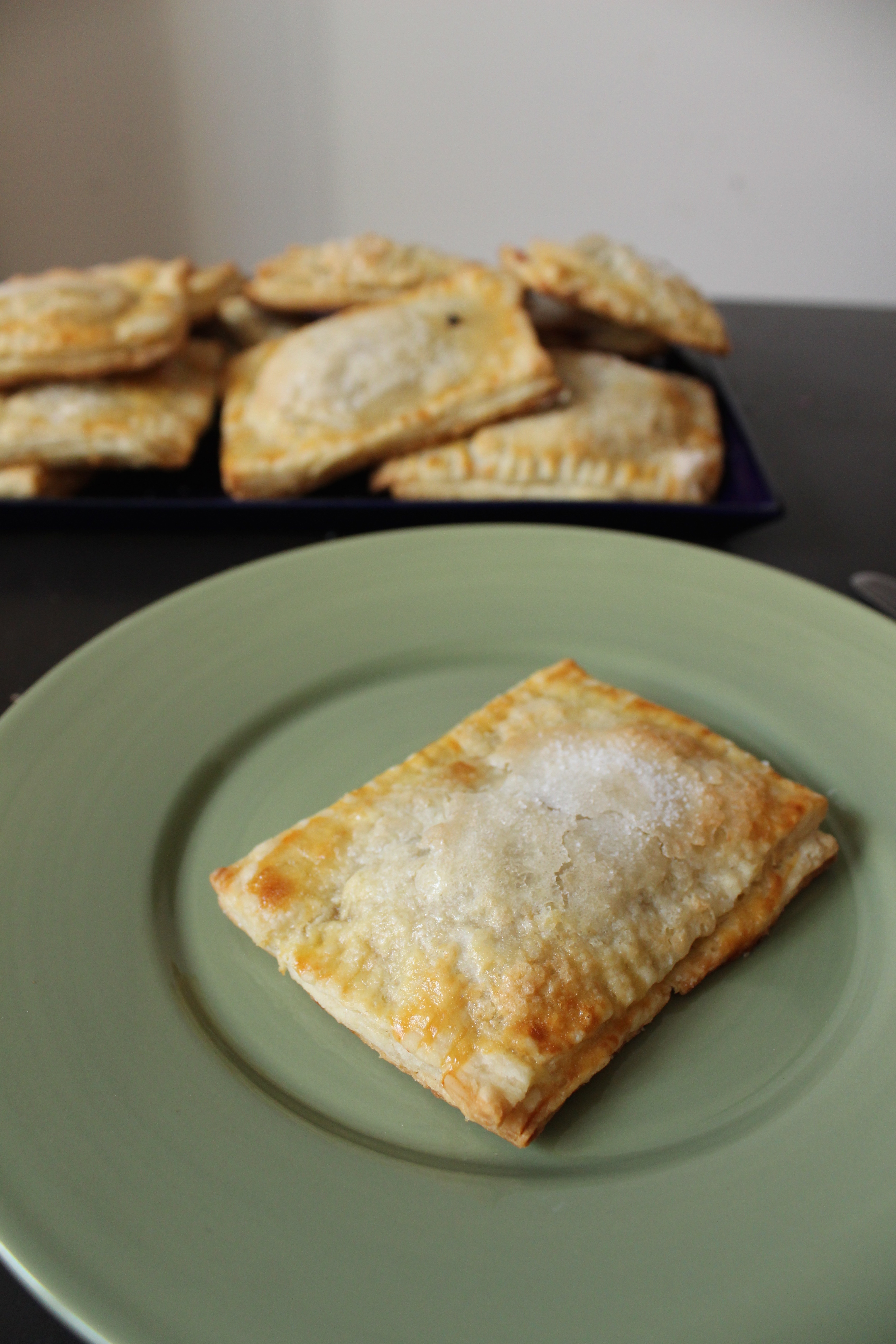 - Preheat the oven to 400 degrees F and line two baking sheets with parchment paper. Generously flour your surface and rolling pin. Roll out one of the disks until 1/8 of an inch thick. Do this with a swift back and forth motion, rotate the dough 45 degrees, then repeat until it is sufficiently thin. Take your time with this, young Jedi. Trim off the edges with a pizza cutter or sharp knife and cut to make 4 squares or rectangles. In a small bowl, beat the egg with a dash of water. Brush two of the squares with the egg wash. These will be the bottoms (hehe). Spoon a teaspoon of the cooled fruit compote onto the two squares. Place the adjacent squares a top the squares with filling, pulling a bit to ensure the edges line up. Crimp the edges with a fork. Brush the top with egg wash and cut a slit to let the steam out while they are in the oven. Place the two completed hand pies on a baking sheet and sprinkle the tops generously with sugar. Bake in the preheated oven for about 20 minutes. While those bake, work on rolling out the next quarter of dough and assemble the next two hand pies in the same fashion. I alternated by sticking the second batch in the oven as soon as it was ready and calculating the extra time required when the first timer went off, but it really browns best when there's only one baking sheet in the oven at a time. Continue with the rest of the dough. Let cool a few minutes before moving onto a wire rack for complete cooling.