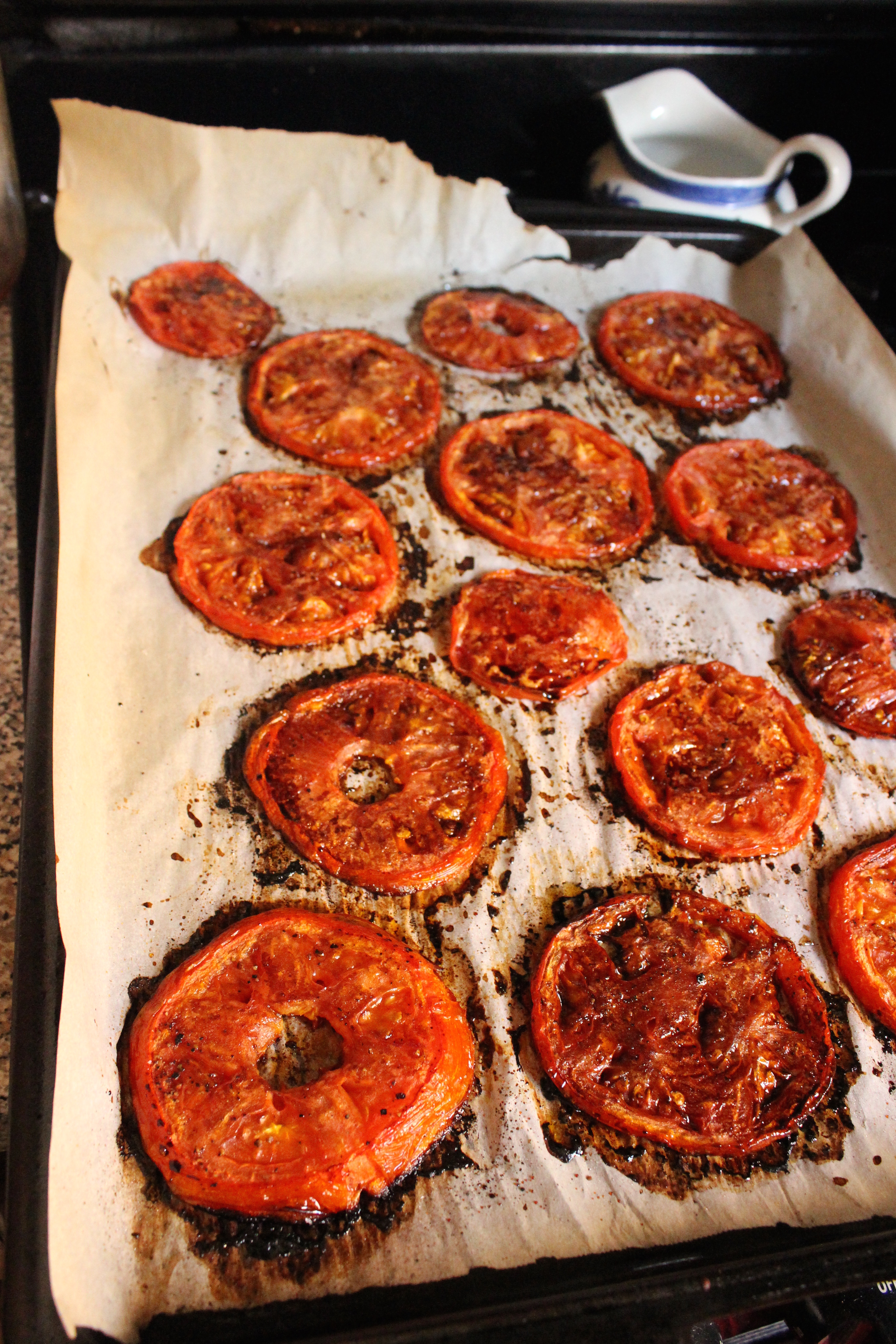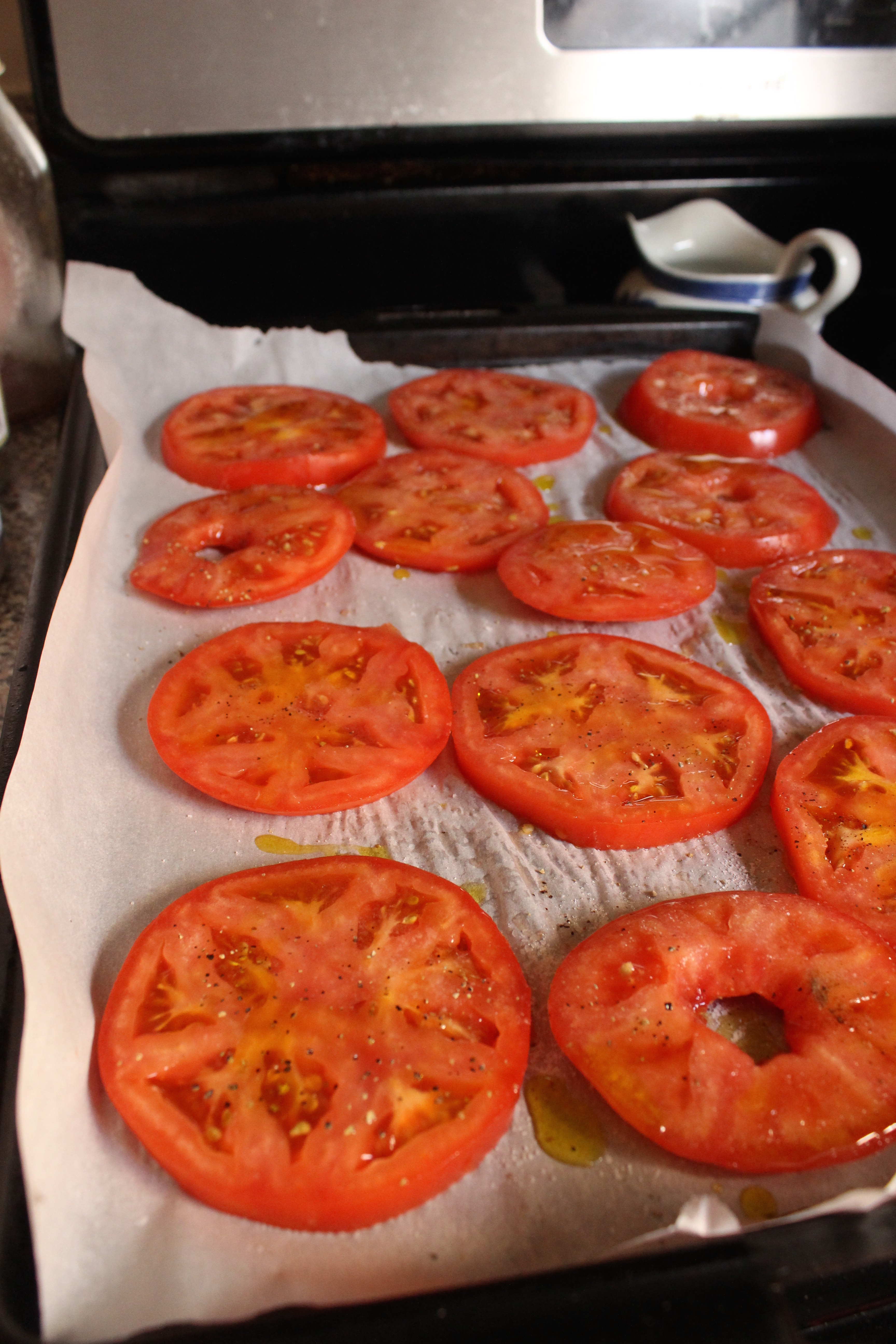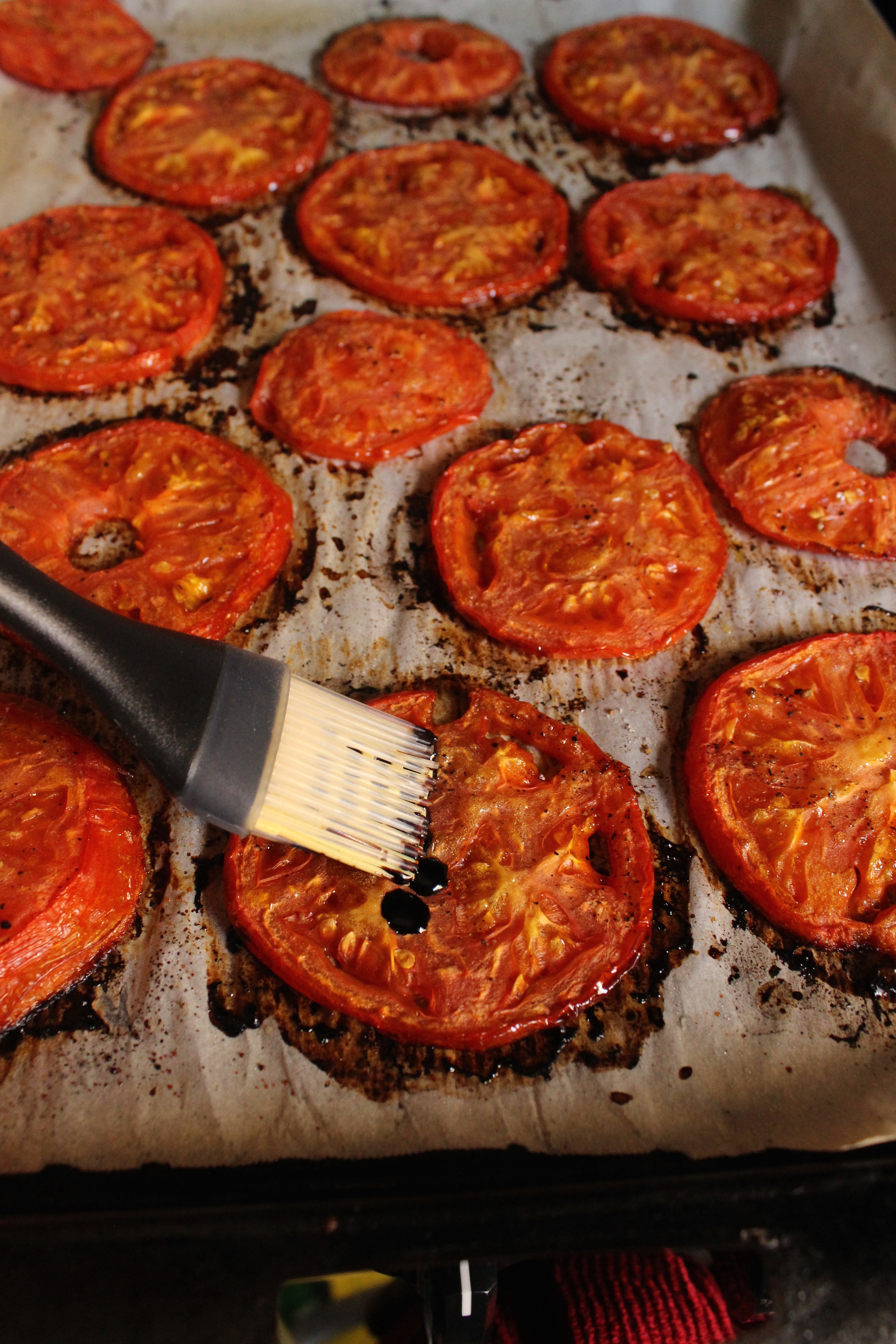 - Slice 2 tomatoes between 1/4 and 1/2 inch in thickness (see pictures). Arrange slices on baking sheet lined with parchment and season�liberally with salt and pepper (about 3/4 tsp salt and 1/4 tsp pepper). Lightly sprinkle tops with 1 tsp sugar, 2 tbsps olive oil and 1 tbsp balsamic vinegar*. Use a pastry brush or your hands to smooth out all the seasonings. Bake in preheated oven for 40-45 minutes.