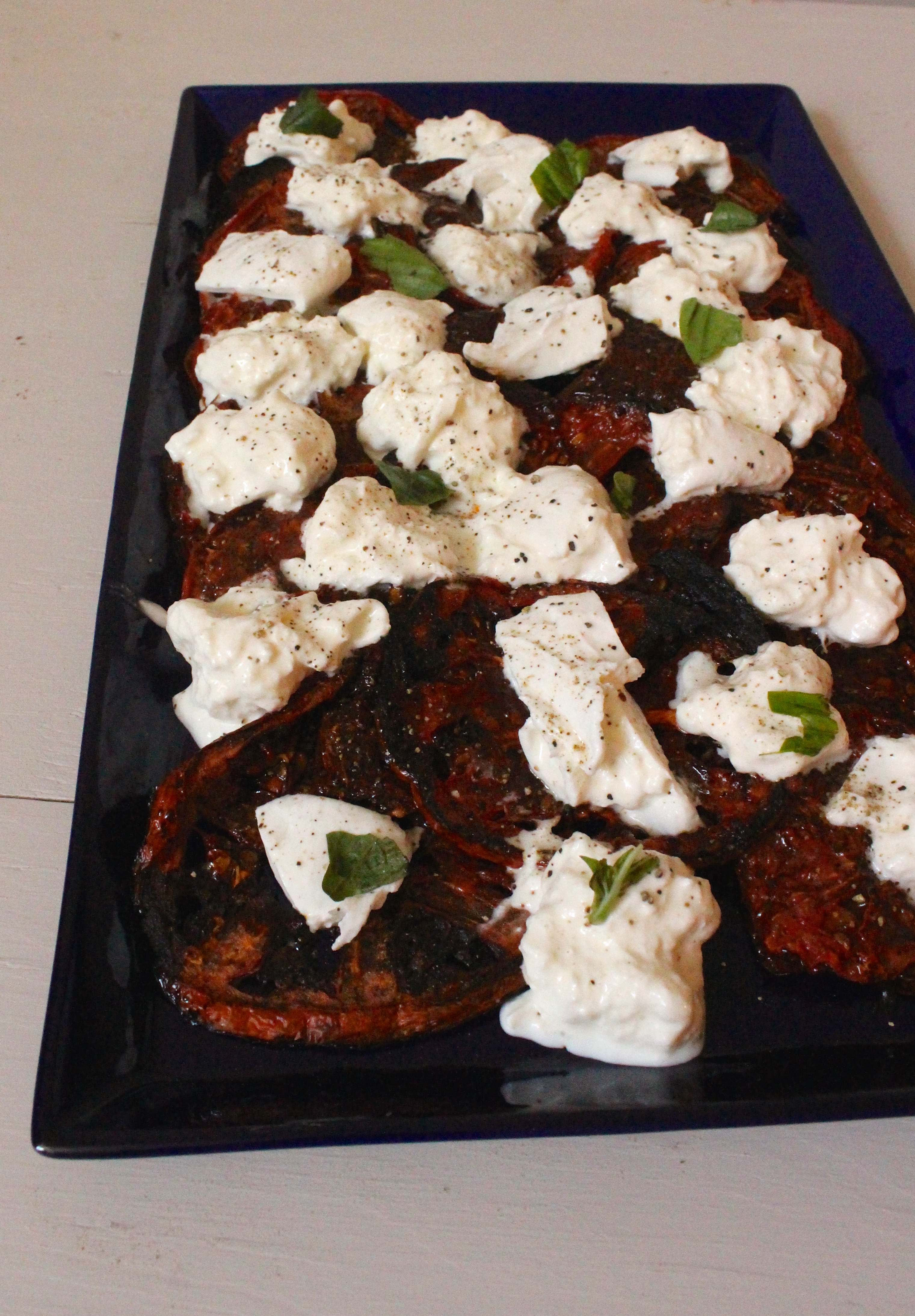 - Arrange tomatoes on platter, overlapping them slightly. Remove burrata from solution and place on cutting board. With a SHARP knife, slice the burrata into 1/2 cubes (as shown above). Top the roasted tomato slices with the burrata pieces. Sprinkle the tops with black pepper and torn basil.