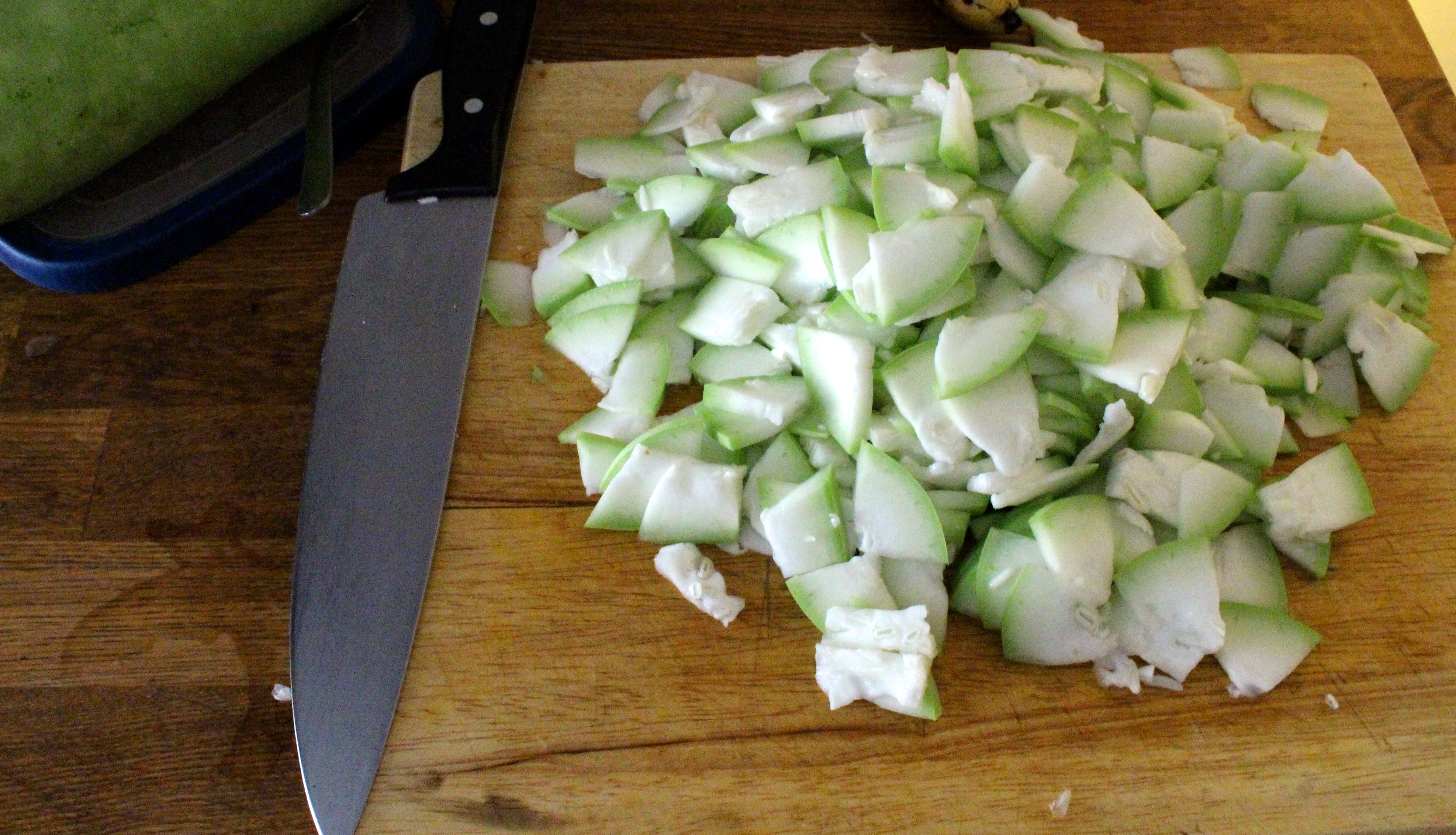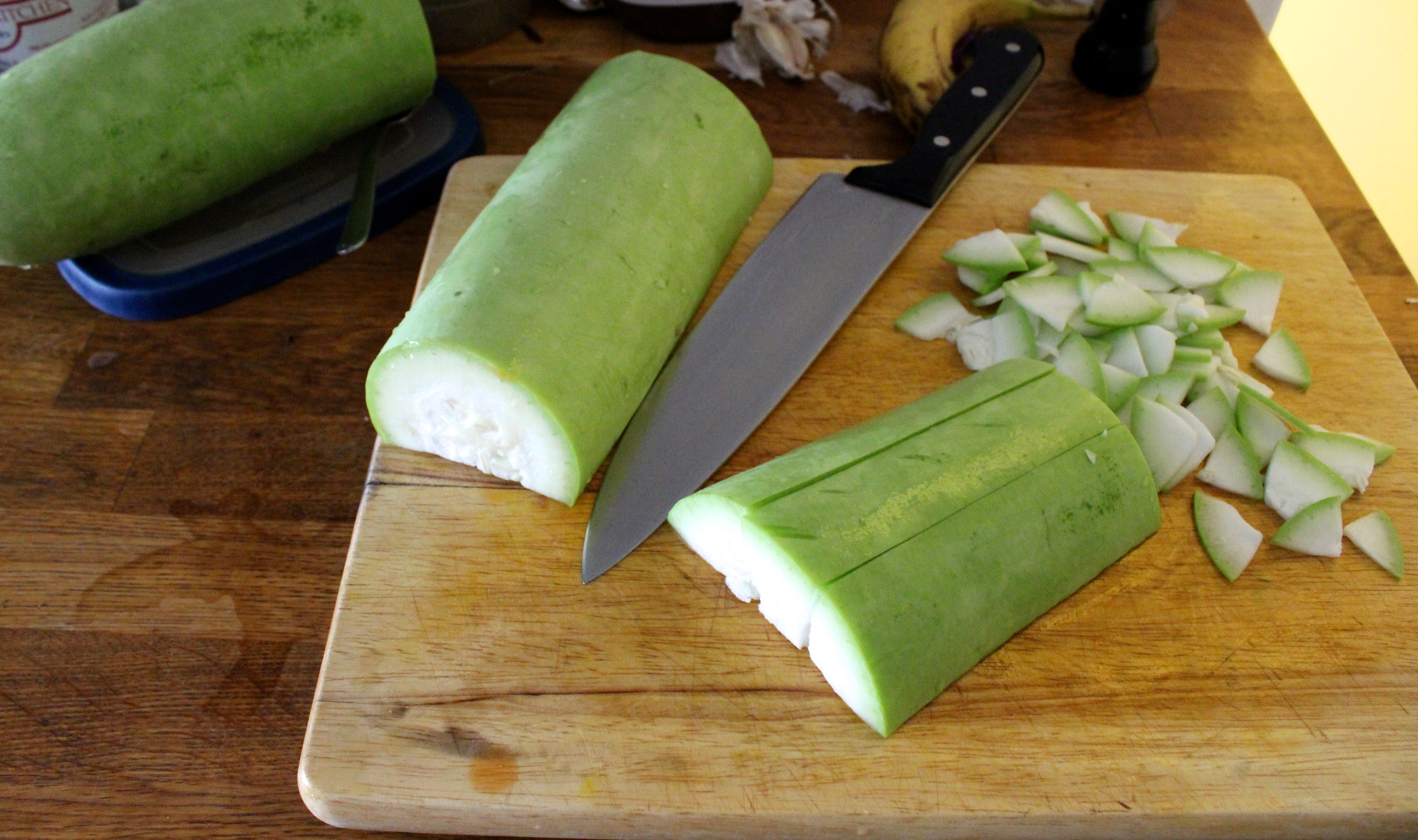 - Peel the gourd (I didn't and I deeply regret it). Cut off both ends and halve it so it's easier to manage. Take one half and stand it up and�cut down the middle. Slice into thin (1/8 in thick) slices.