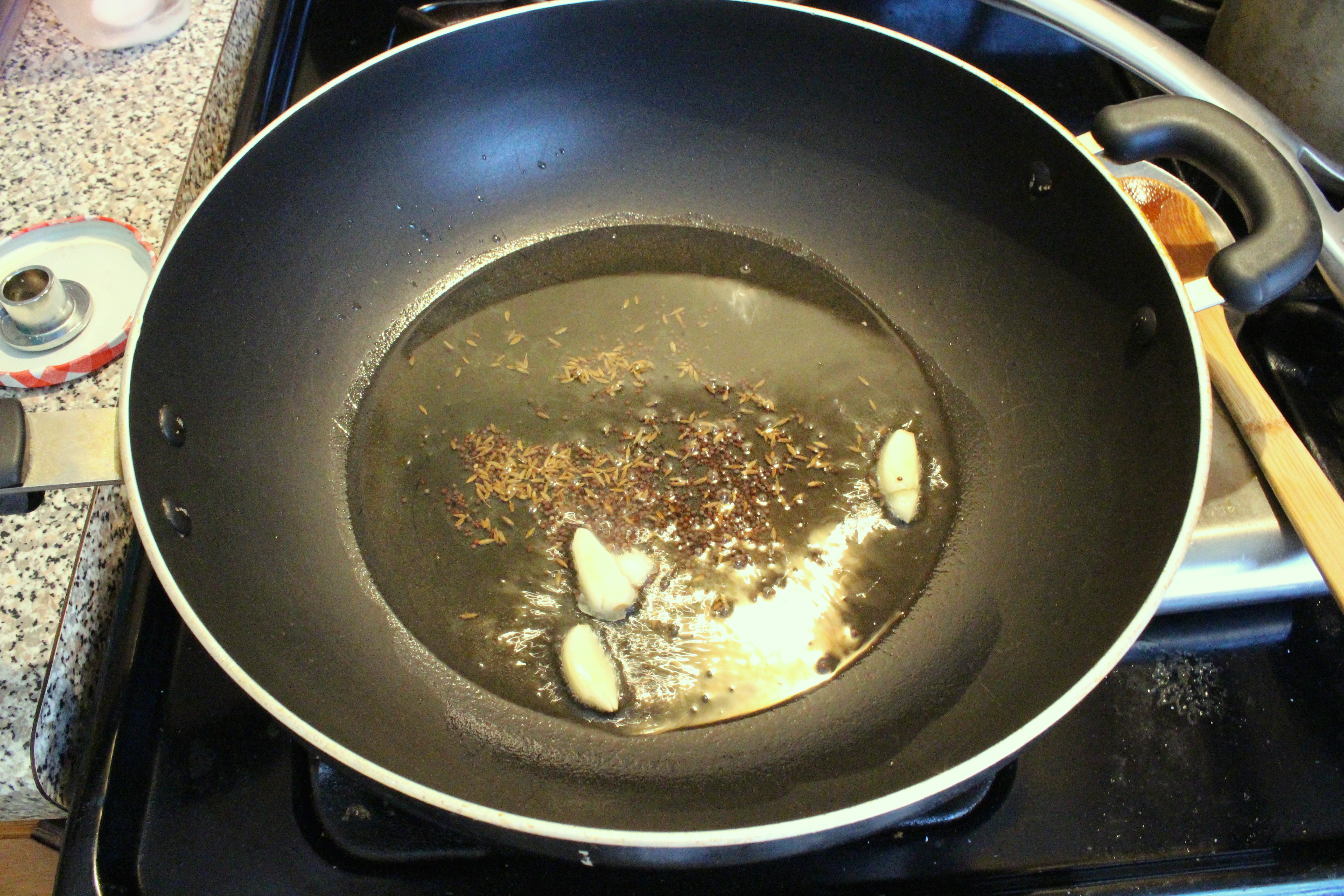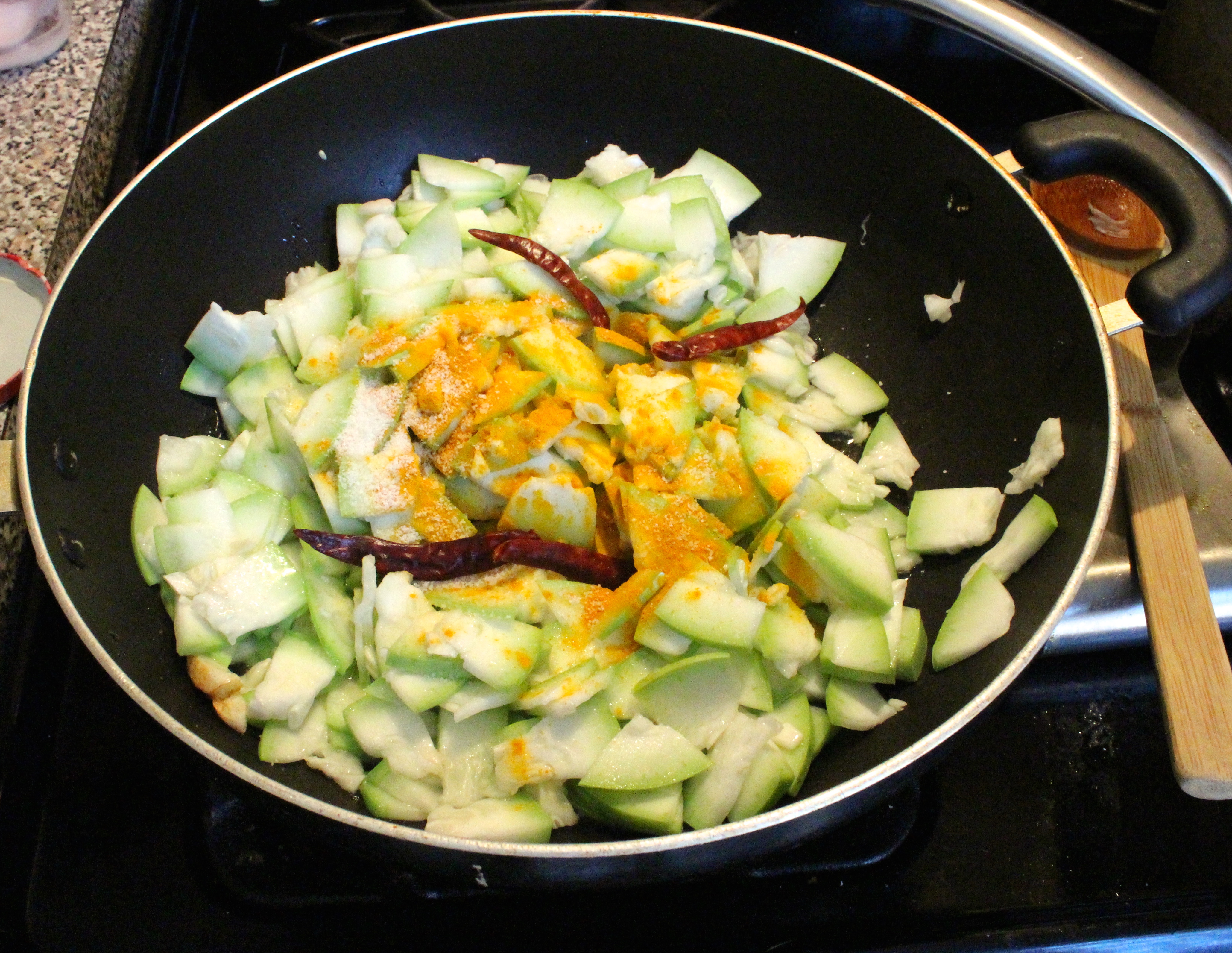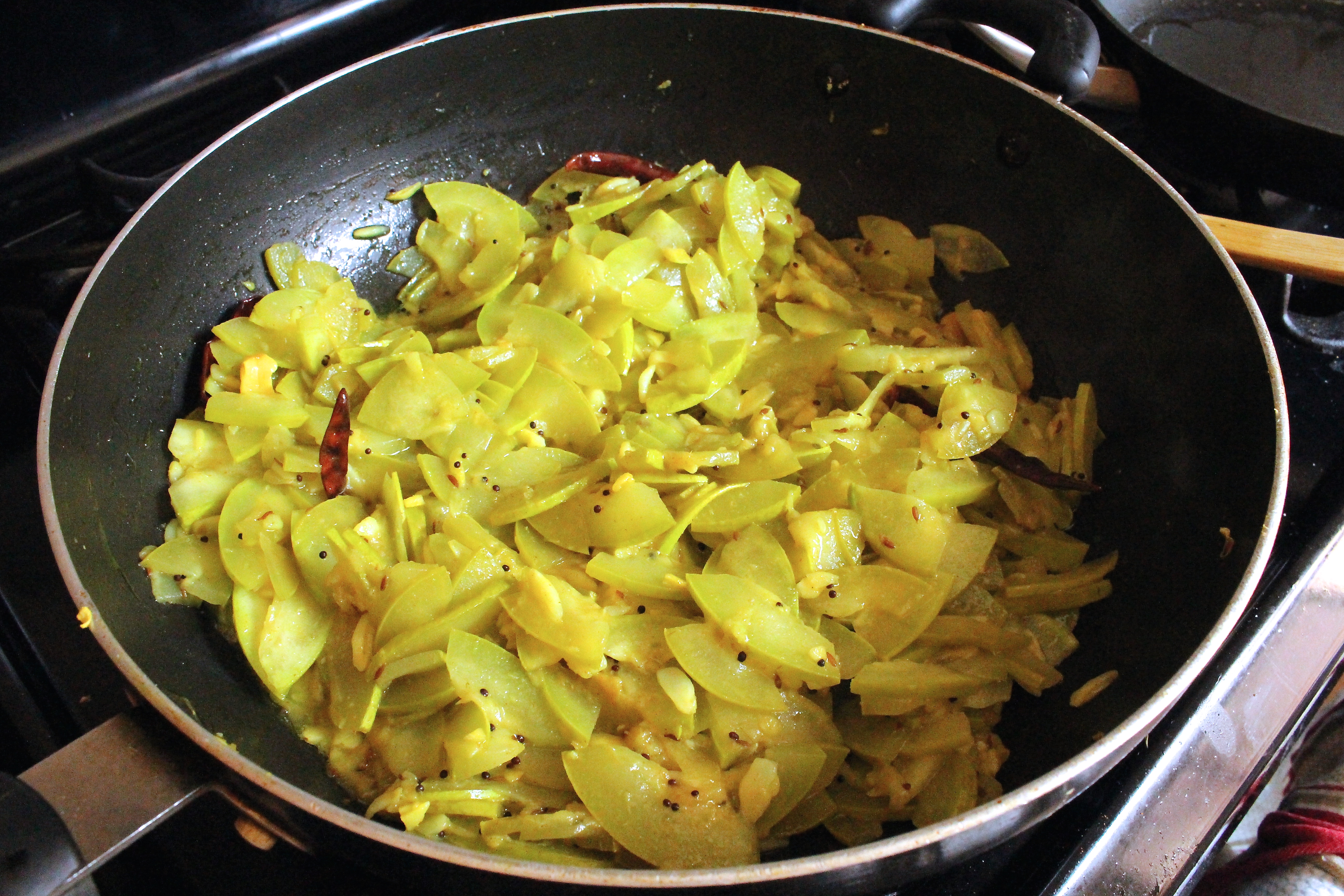 - In a large non-stick wok or�saut� pan, heat oil over medium high heat. Add mustard seeds, cumin seeds, garlic and dried chilis. Cook until fragrant (about 30 seconds - you don't want it to burn). Open up your windows, too. Toasted chilis make you cough up a storm! Add the sliced gourd, turmeric and salt. Cook over medium high heat, stirring frequently, until cooked through: about 15 minutes. If the veggies start to brown, reduce heat to medium and keep stir-frying. Check for seasoning (salt). Top with chopped cilantro. Serve alongside rice and daal.