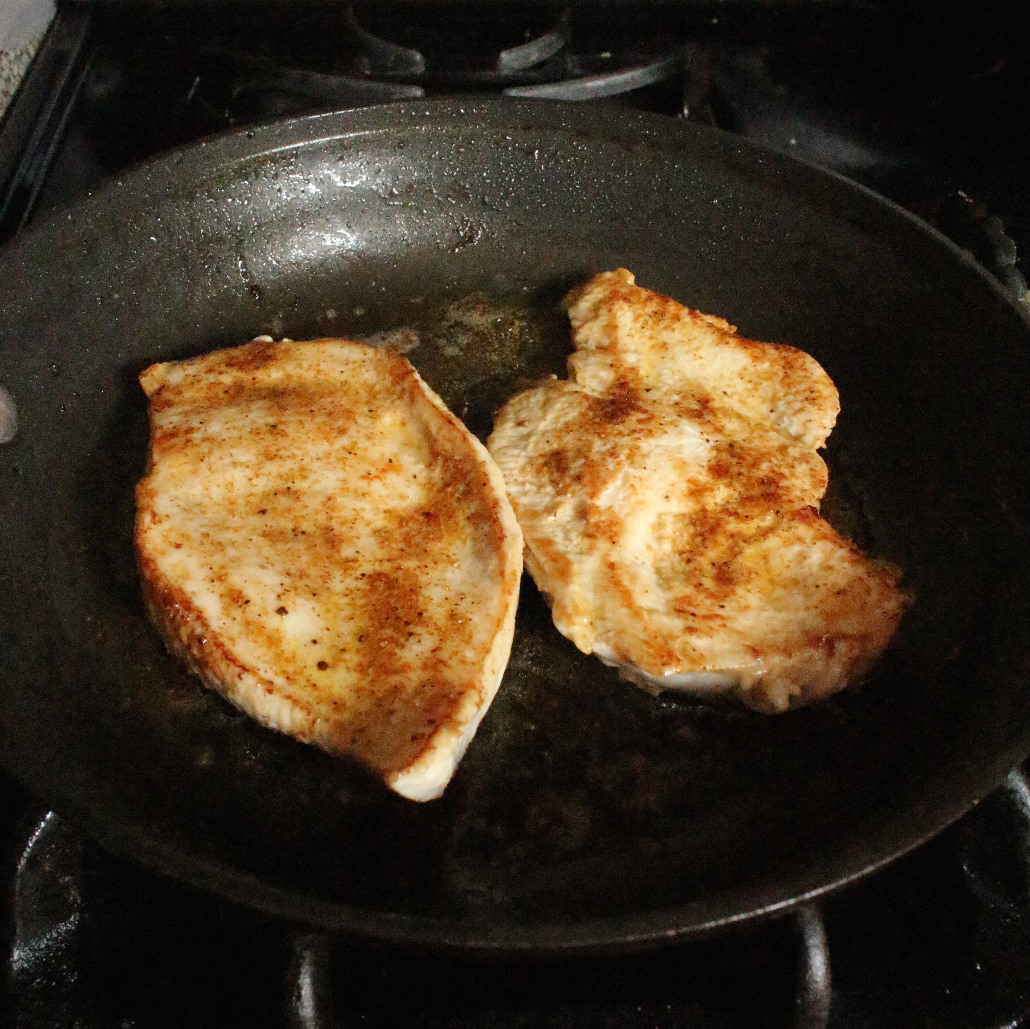 - In a large fry pan over medium high heat, heat 1 tbsp oil and 1/2 tbsp butter. When the bubbling of the butter dies down, add two pieces of the chicken cutlets. Cook for 2-3 minutes on each side. You'll know when to flip when the bottom side is golden brown and the white (cooked) part of the chicken creeps up to the middle. Flip and cook for an additional 2-3 minutes.