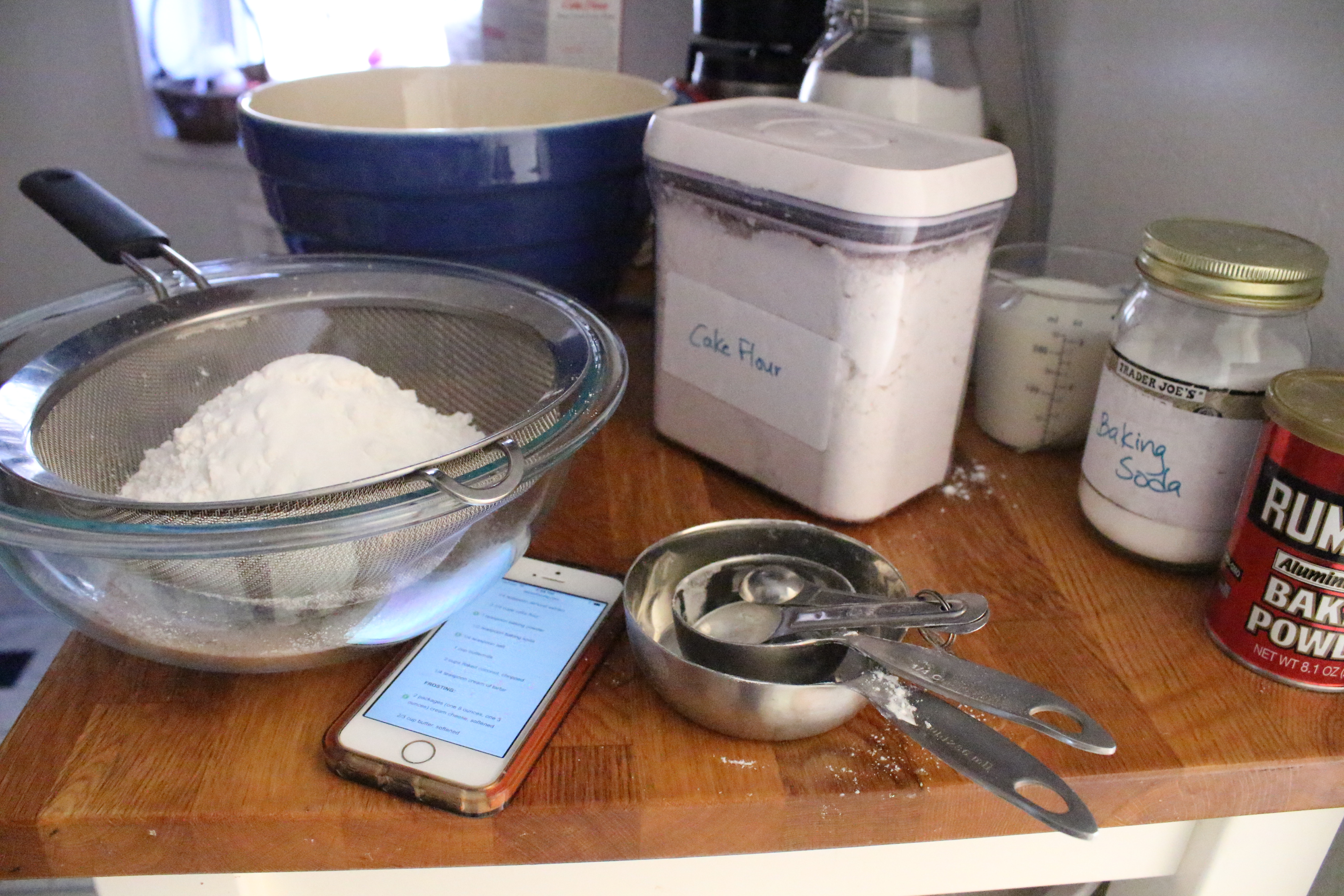 - Sift cake flour, baking powder and baking soda into a medium bowl. Add salt and give a gentle stir with a wooden spoon. Turn the mixer on low and add the dry ingredients in 3 batches, alternating with with buttermilk. Turn off mixer when dry ingredients are just incorporated.