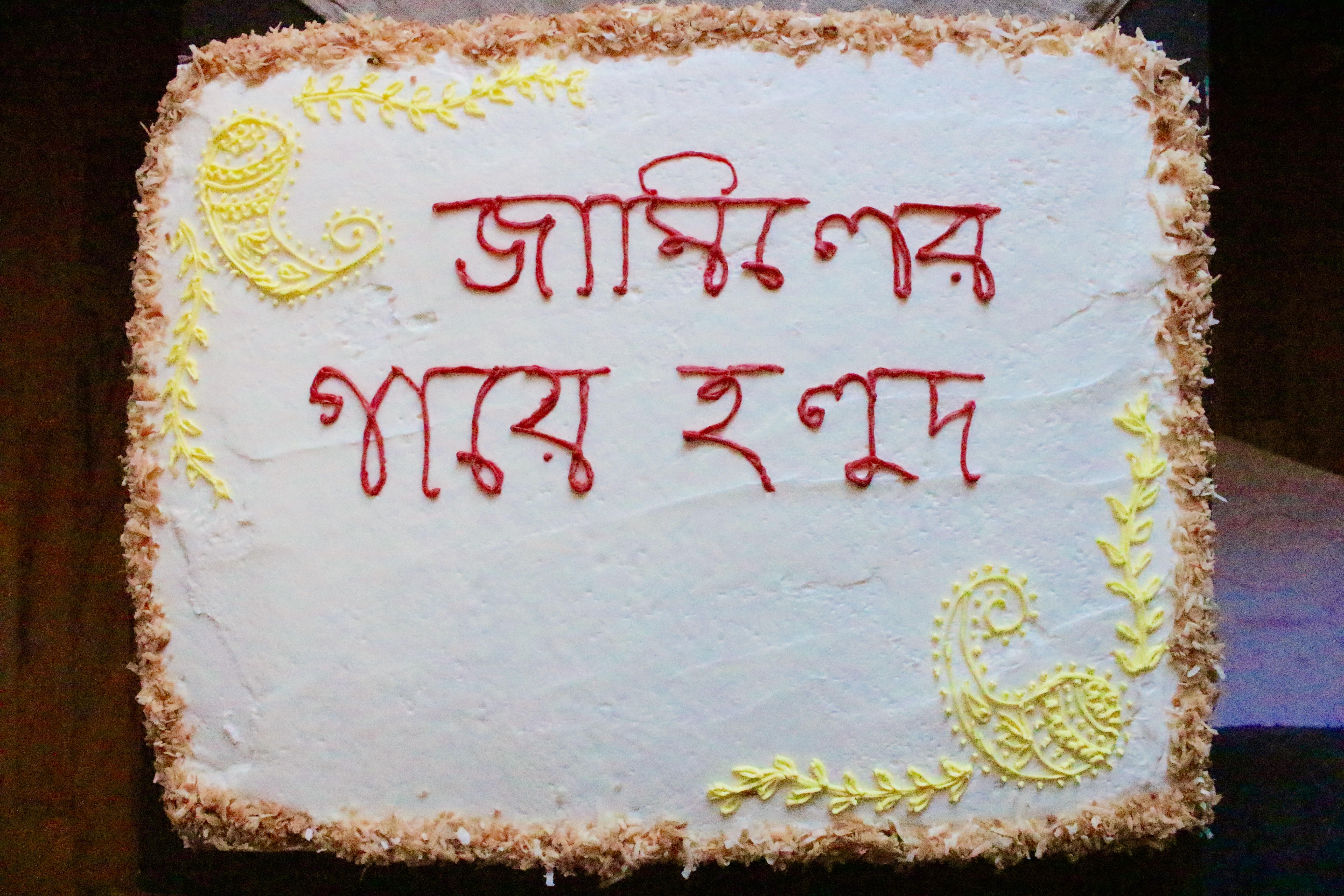 I should probably mention this was for a Bengali pre-wedding party called a Gai Holud. The writing on the cake reads “Jamil’s Gai Holud”. It’s a tradition wherein the bride or groom is rubbed all over with turmeric paste and then bathed publicly (with the Bengali equivalent of a bathing suit on). �Here in America, we do a more symbolic version. Bride/groom sits on some decorated platform with an array of sweets in front of him/her. There is a bowl of turmeric paste that is rubbed on a small portion of his or her face, then wiped off.�