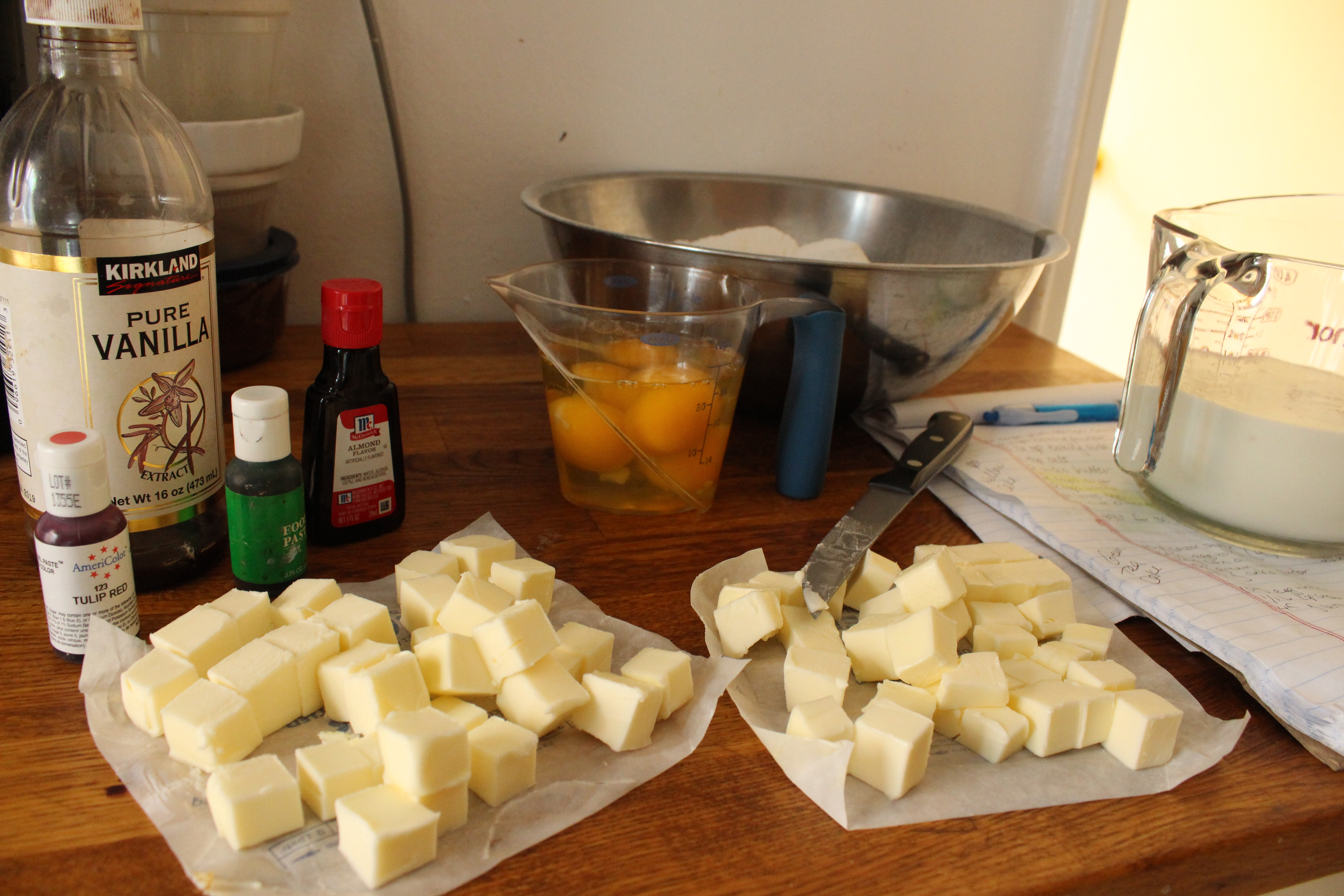 - Divide the batter between three bowls as evenly as you can (I used a kitchen scale to ensure even distribution). Leave one of them untinted, or tint with 2 drops yellow food color. Tint one of them green (drop 2 drops food color and mix with a spoon or spatula; the color will appear minty). Tint the final one red (the color will appear more salmon like than true red). Take care to use separate tools for each bowl so the colors don't mix. Gently pour the batter into the three previously prepared cake pans, red in one, green in one and yellow in one. Smooth out the top and tap on the counter 2-3 times each to get rid of air bubbles.* Bake in preheated oven for 20 to 22 minutes. The edges should start to pull away from the sides of the pan and the top should spring back when touched.