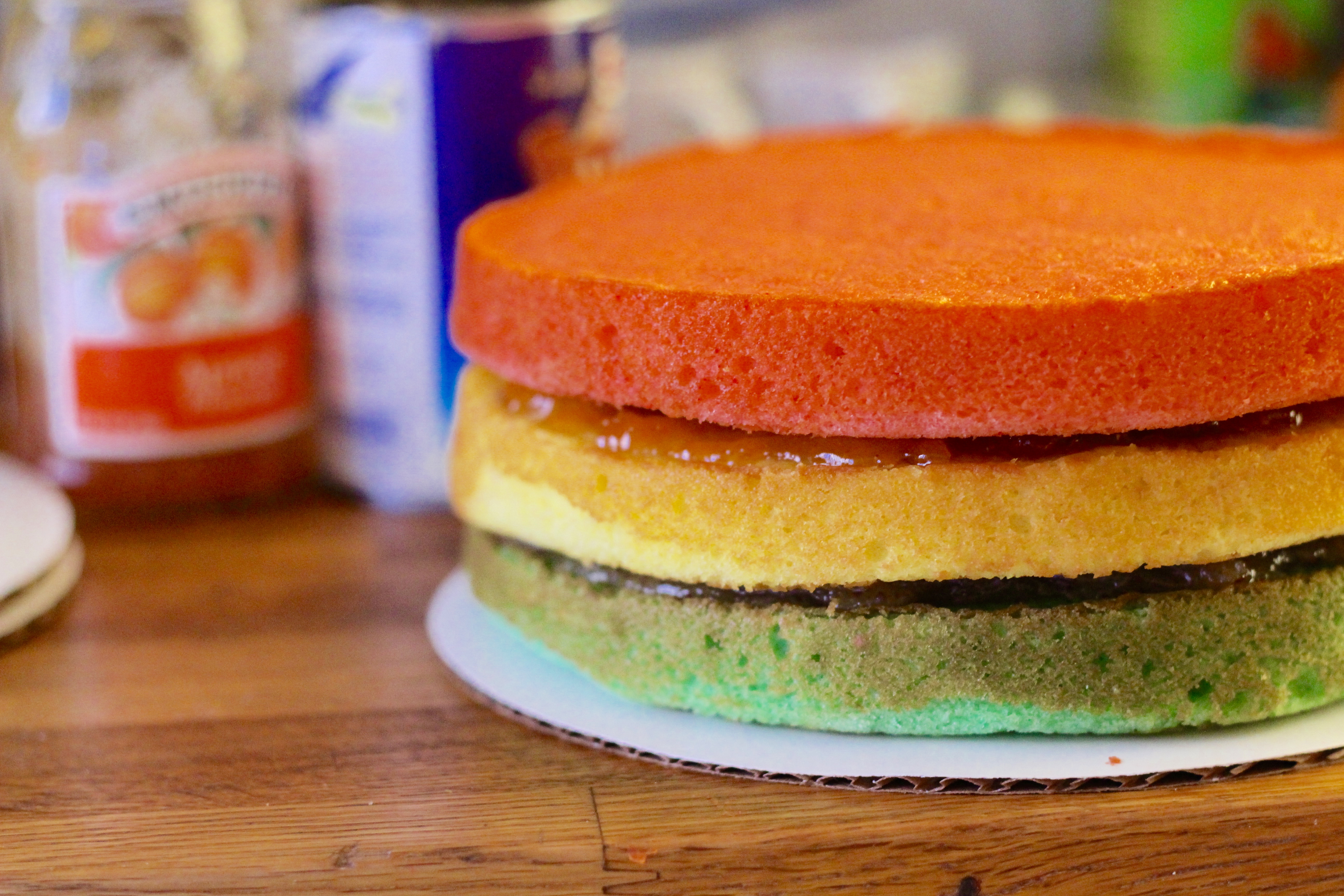 - Next, invert the yellow cake layer as before onto a saran lined cake board. Remove parchment from bottom and carefully place over the green layer. Try to line it up as closely as possible. Using a serrated knife, carefully trim the dome to level the cake. Spread apricot jam evenly, to the edges.