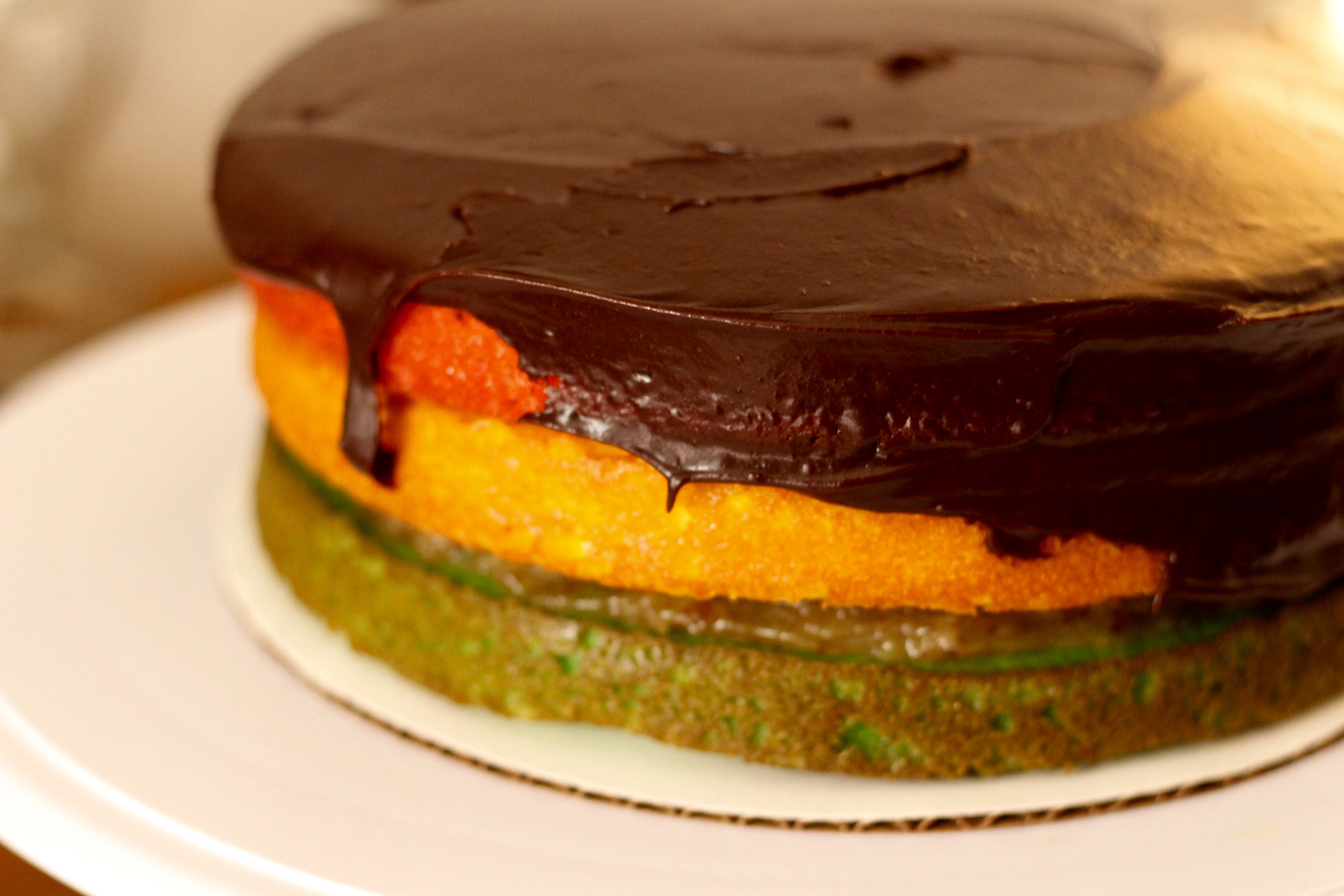 The cake is my go to yellow cake recipe ever since discovering it on The Food Blog to End All Food Blogs: Smitten Kitchen. Instead of an actual rainbow cookie cake recipe that incorporated almond paste in the batter, this is a light, fluffy, buttery yellow cake flavored with vanilla and almond. The rainbow cookie part comes in the filling, with almond between one of the layers and apricot jam in the other. It’s Beethoven’s fifth�symphony of flavors. The tartness of the jam. The nuttiness of the almond. The chocolatey-ness of the frosting. All with the backdrop of the most glorious yellow cake.