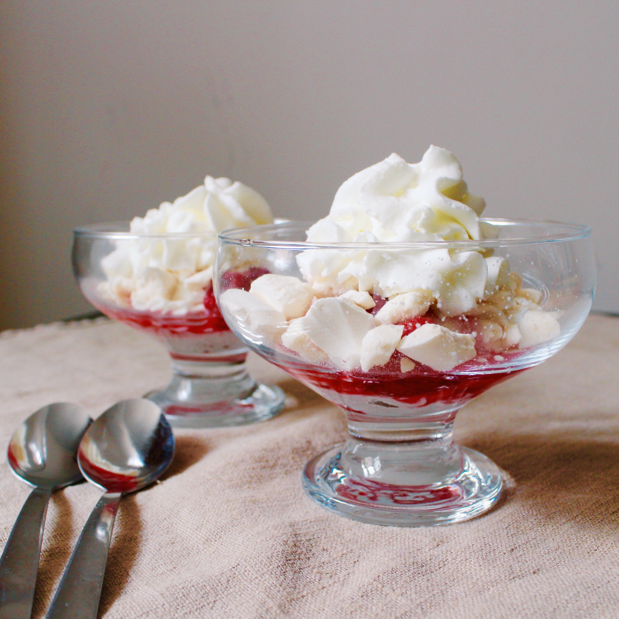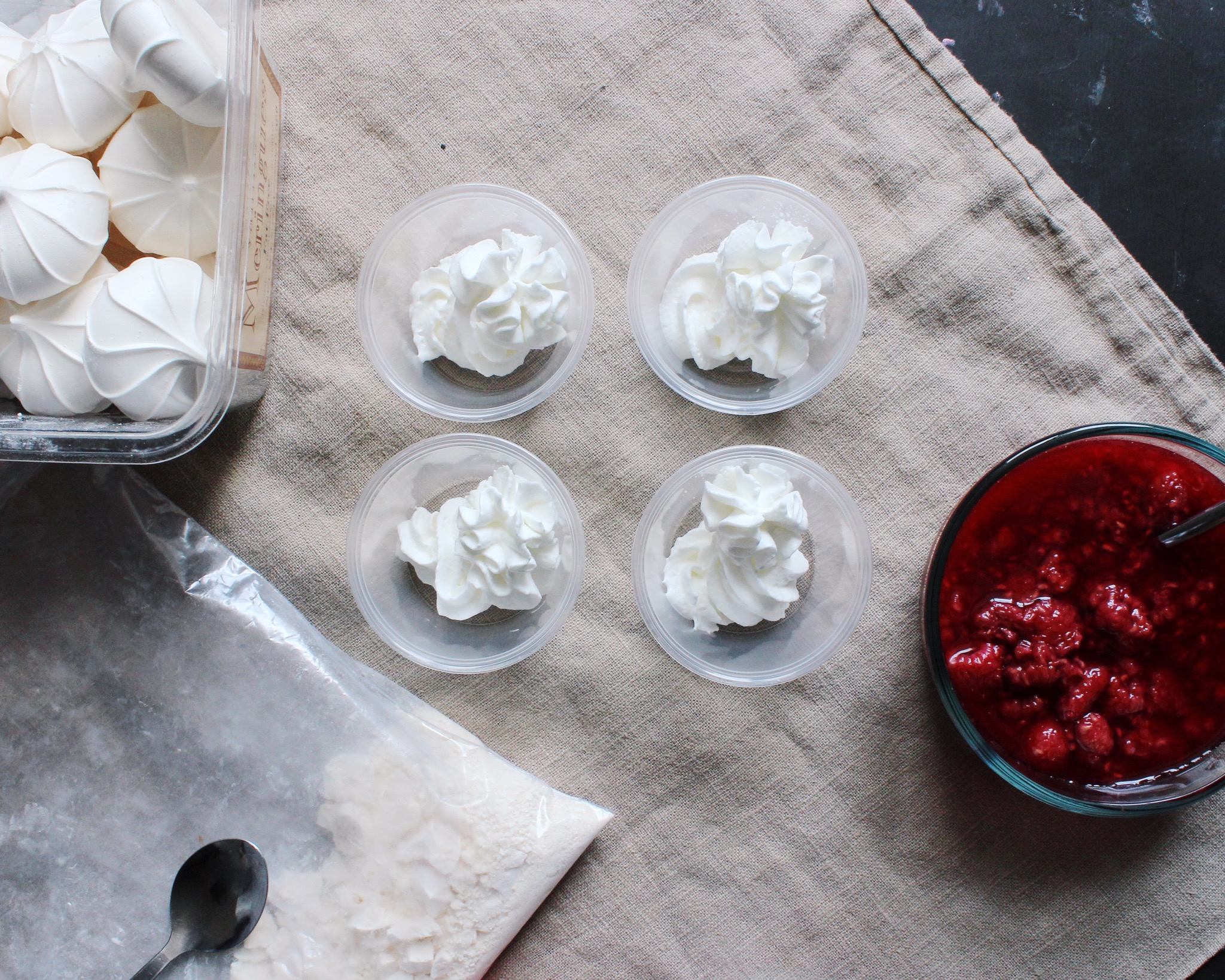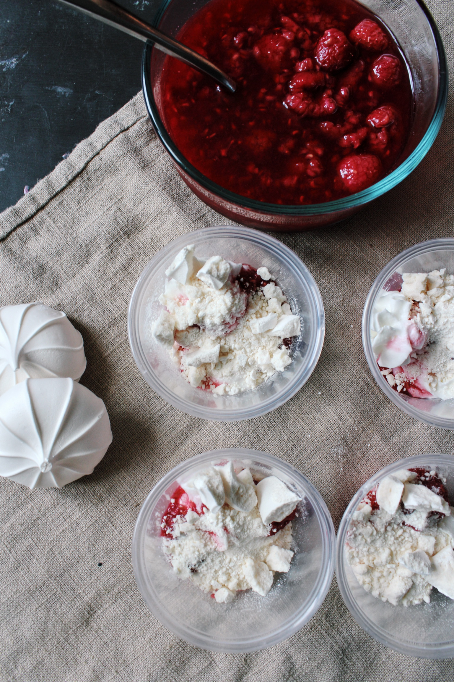 - Layer about 1 tablespoon of the whipped cream, 1 tbsp raspberry compote and 1 tsp crushed meringues in a dessert cup or glass. Top off with whipped cream and enjoy immediately.